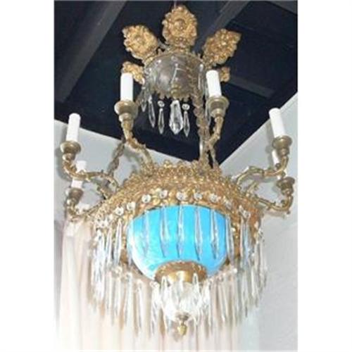This is a stunning crystal, turquoise/blue colored glass and dore' banded and crowned chandelier. The turquoise/blue glass bowl is of excellent color and clarity and the form is graceful and elegant....a real beauty!!!