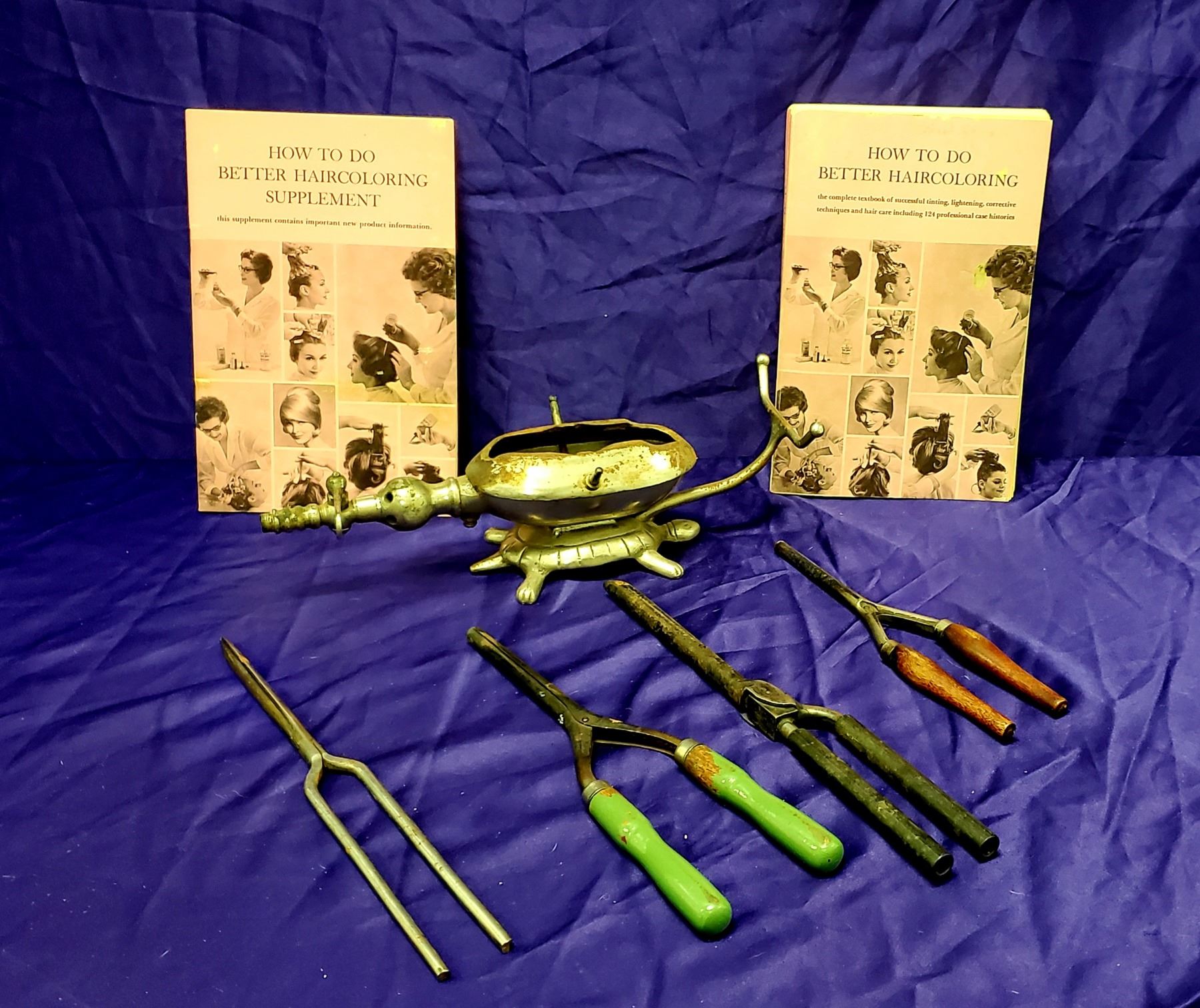 This 7 piece lot consists of An Antique Curling Iron Heater, 4 Irons and 2 Beauty Hair Books. The books, irons and heater all make for a great display for the
