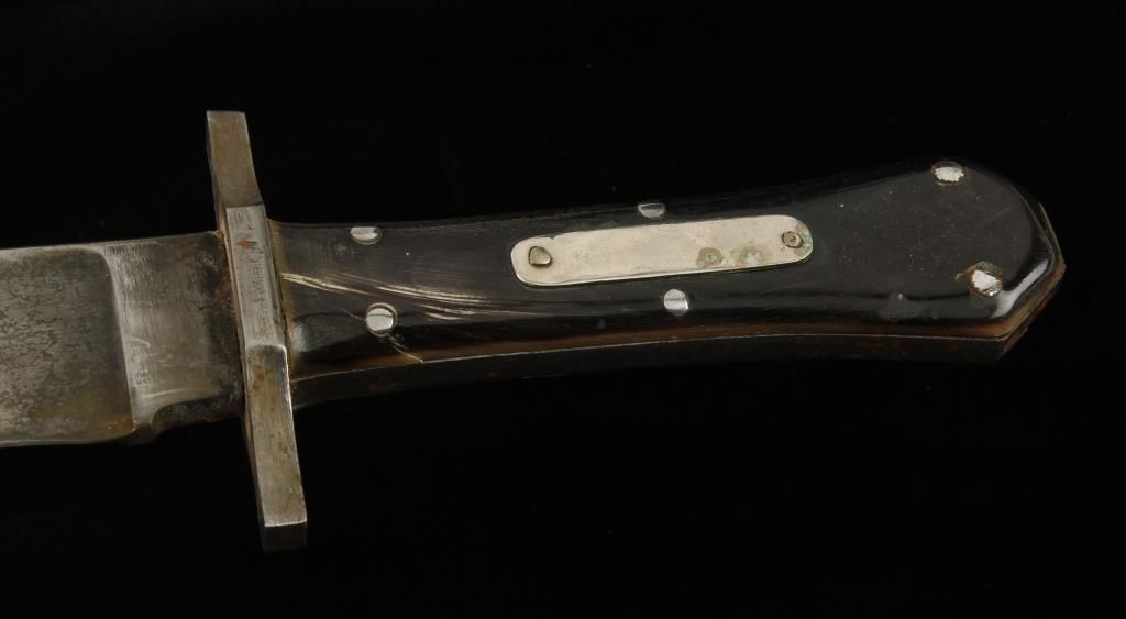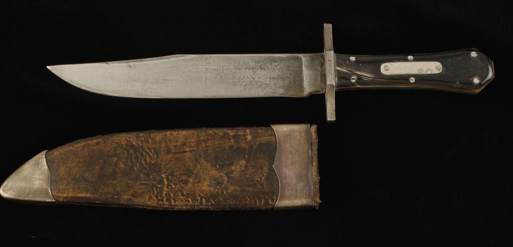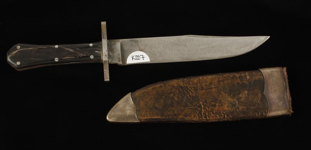 With horn coffin handle and silver mountings 11-1/2" overall with 7" blade. Includes leather scabbard.