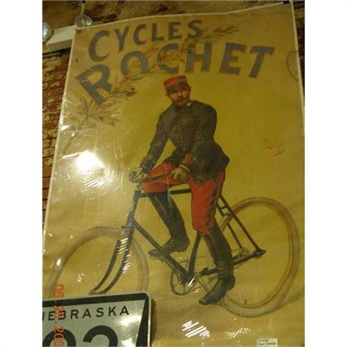 Absolutely awesome French Cycles Rochet Poster! Circa 1900. This piece is signed with what looks like "Pichat" or "Richat." On the lower right, along the border, it reads "IMP.Camis.Paris." Measures 76 inches high and 48 inches wide. There is some water damage along the edge. Located in our premiere antique shop in Lincoln, NE.