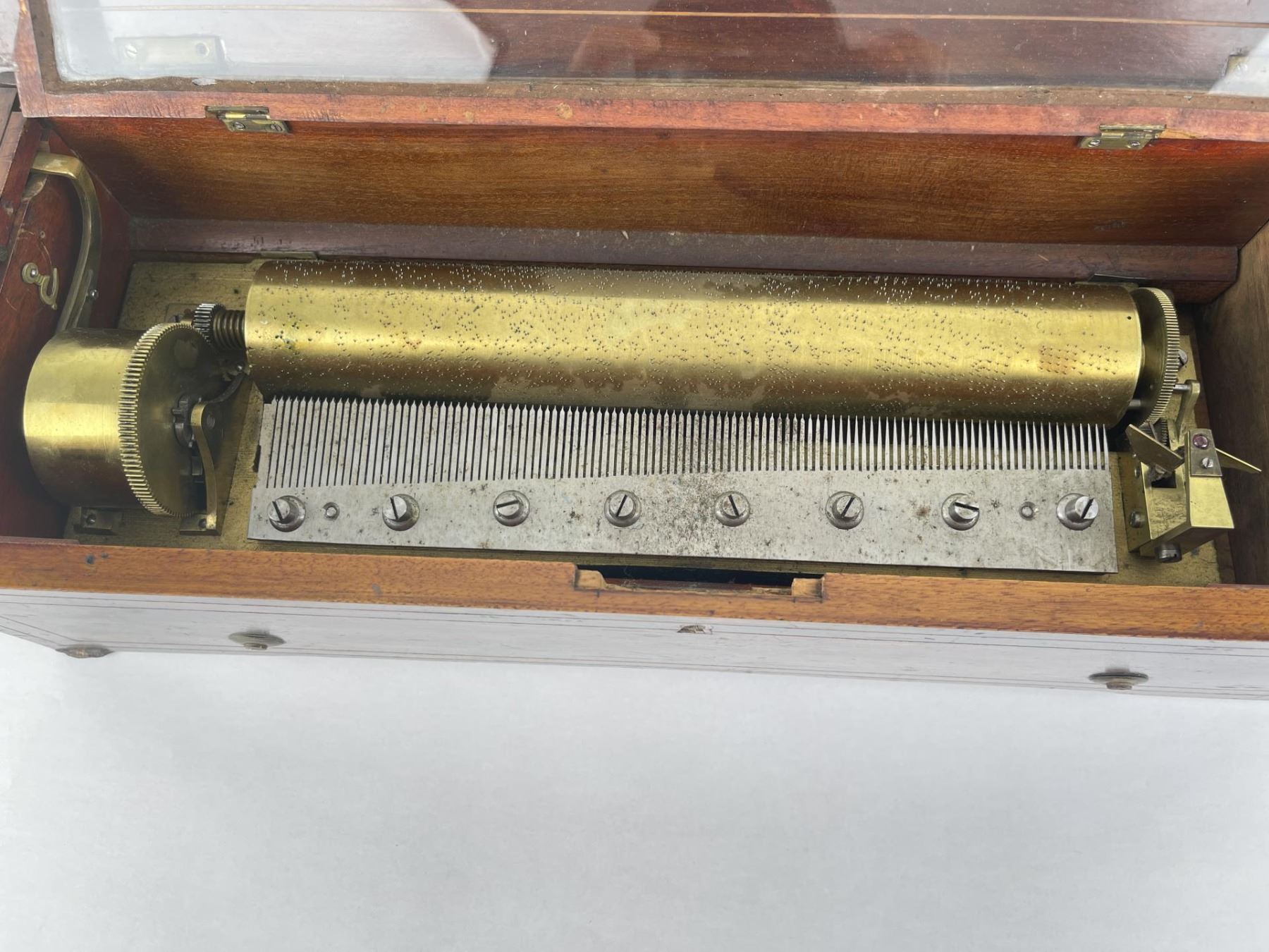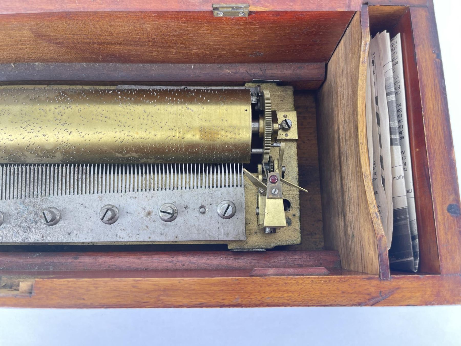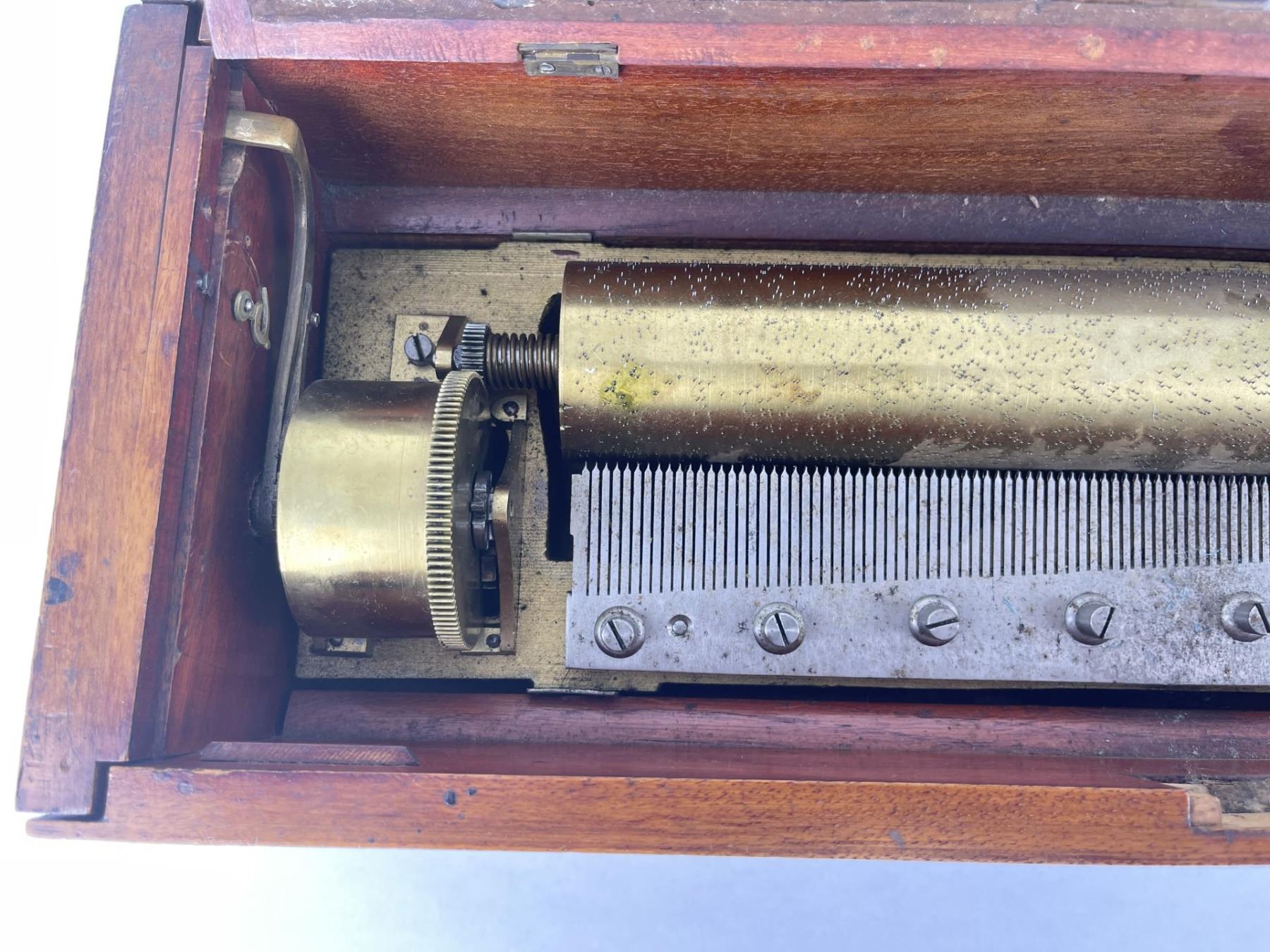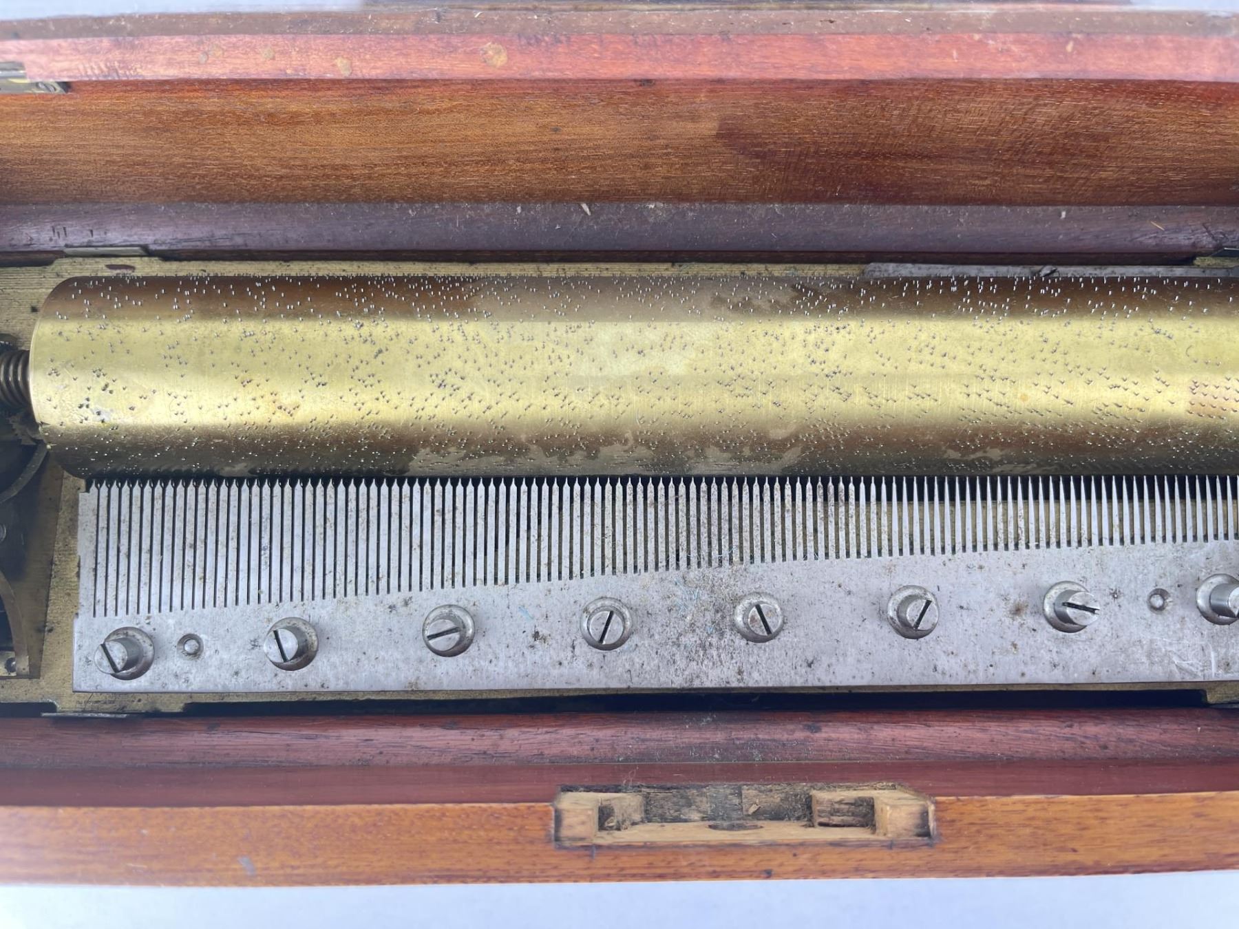 Nice old piece. 19 3/4" long, 7 1/4" wide, 5 1/4" tall. Working order. Sounds wonderful. Comb is not broken or damaged.