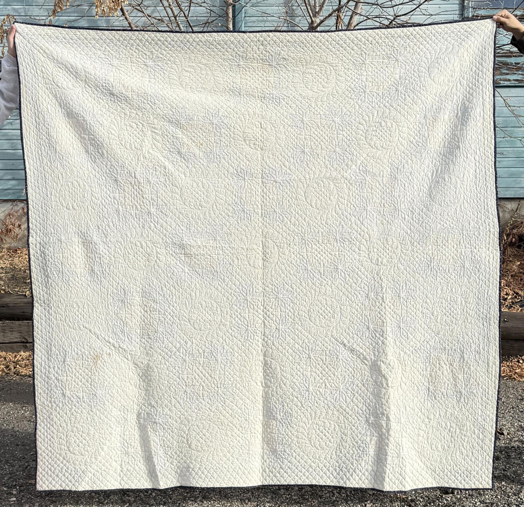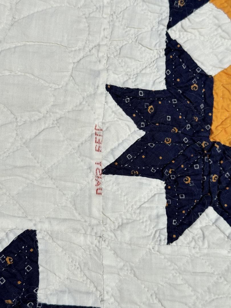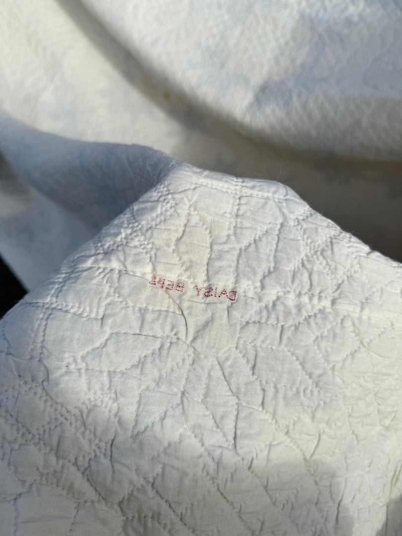 84" by 84". Name of quilter is sewn in, Daisy Bell.
