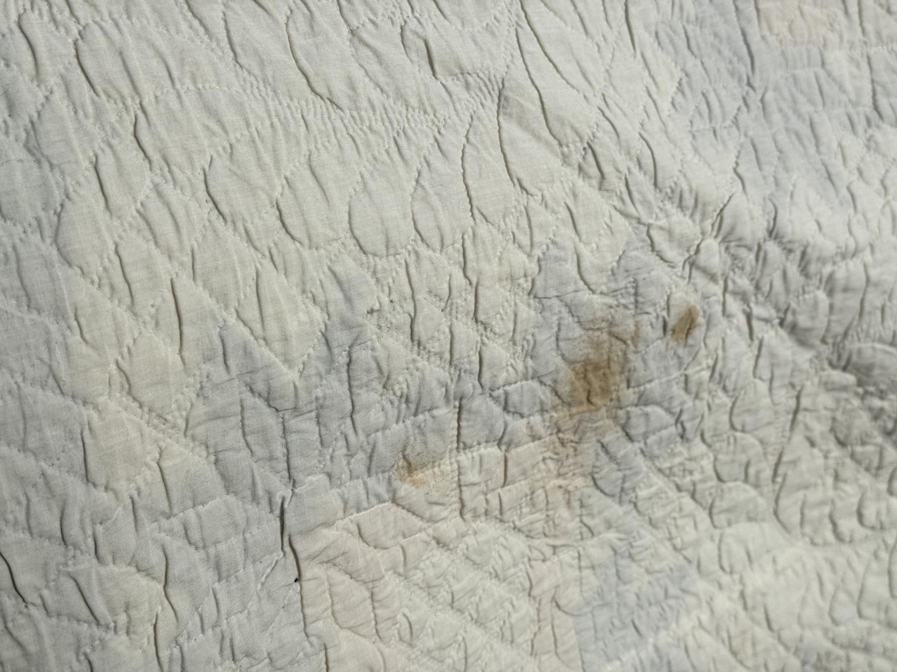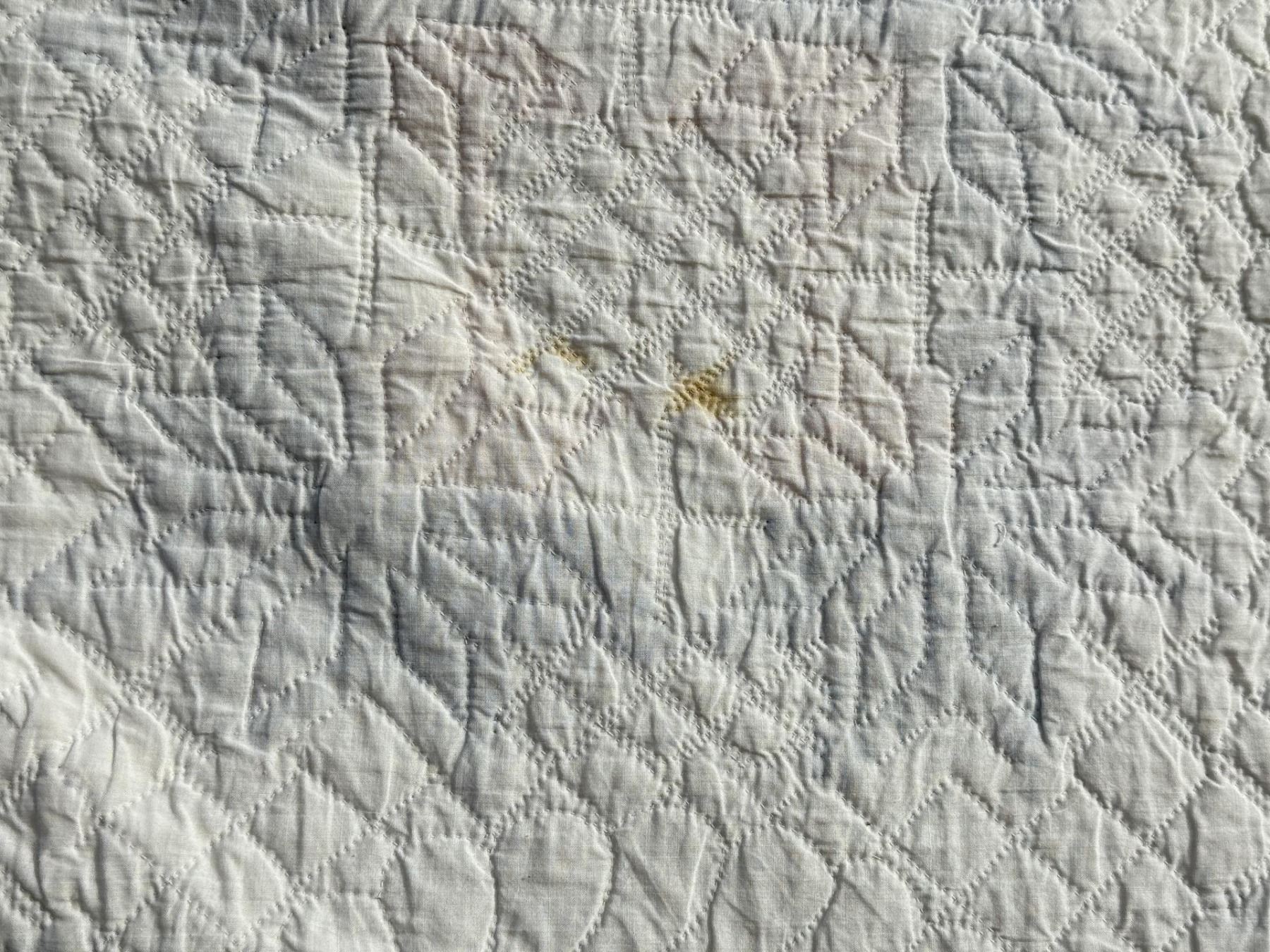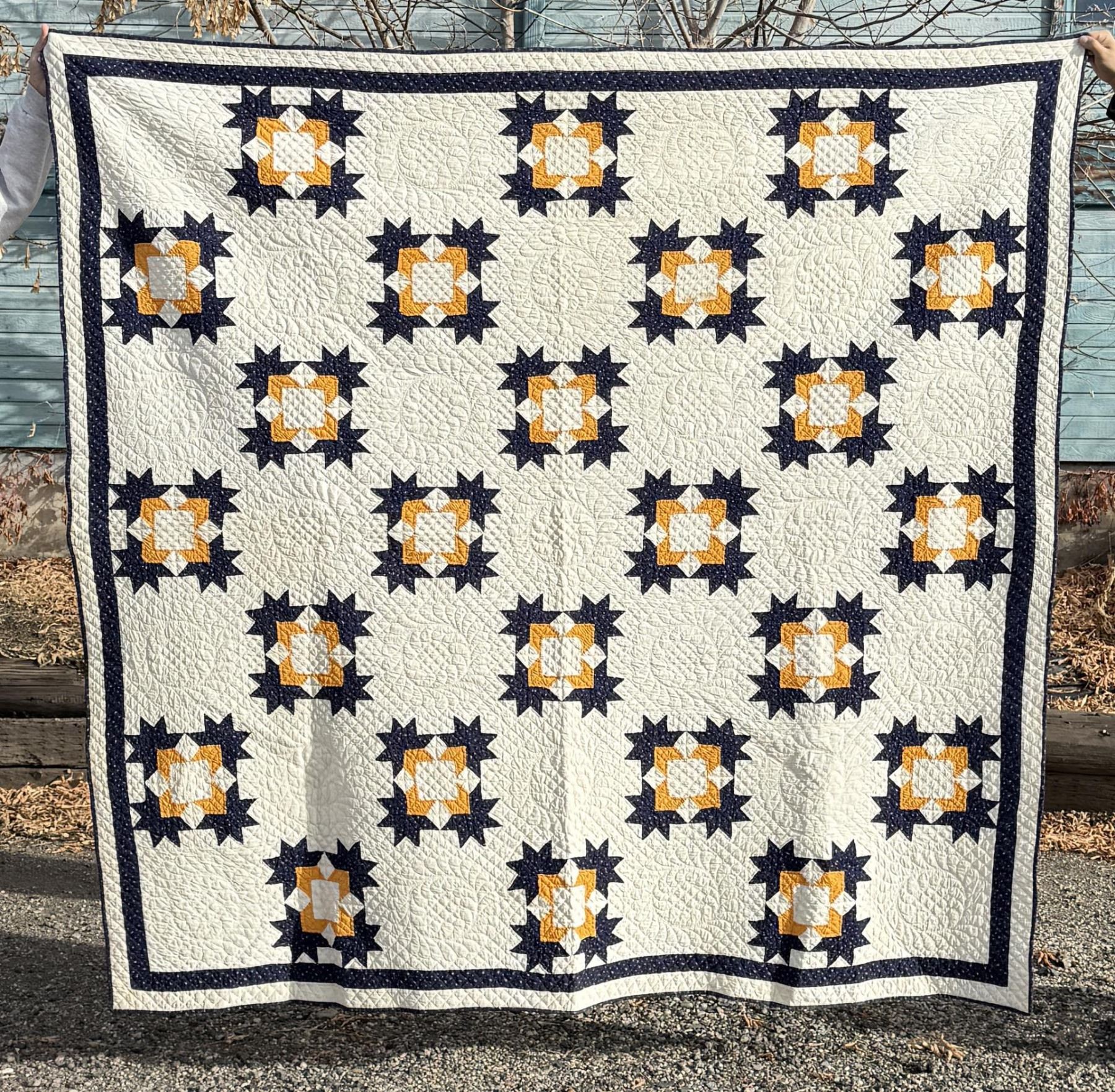 84" by 84". Name of quilter is sewn in, Daisy Bell.
