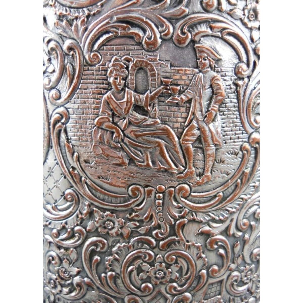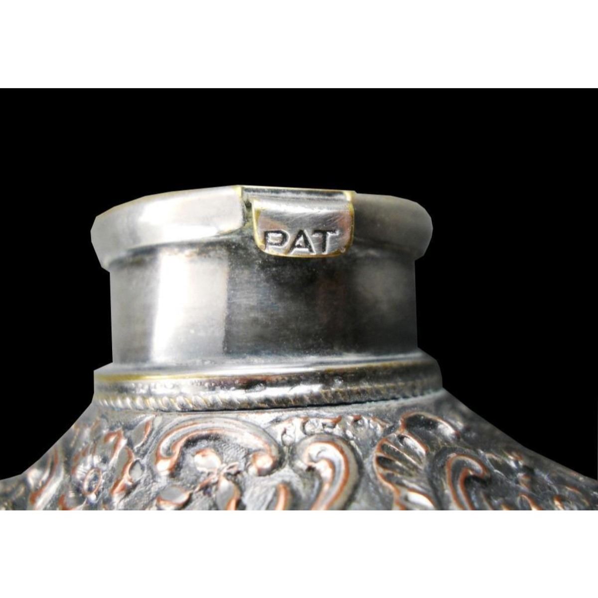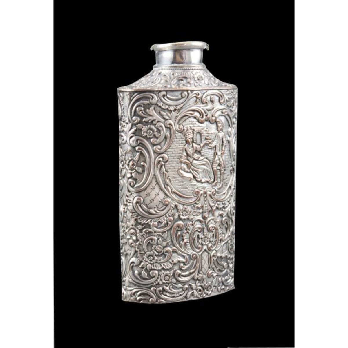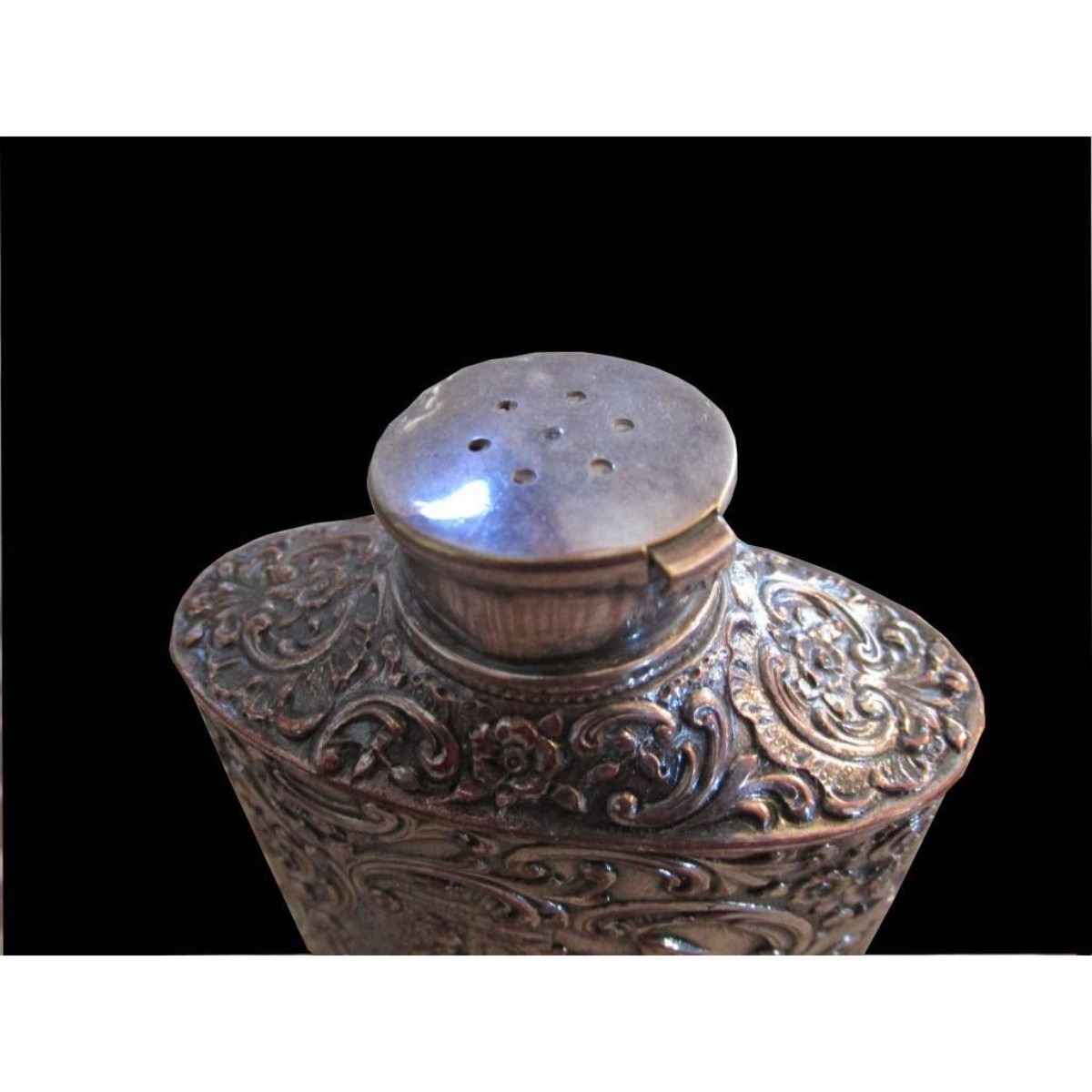 Antique Danish Repousse Silverplate Powder Flask. 17th century scene on face. Marked on bottom. Wear to silverplate on ornate design. 5" x 3".
