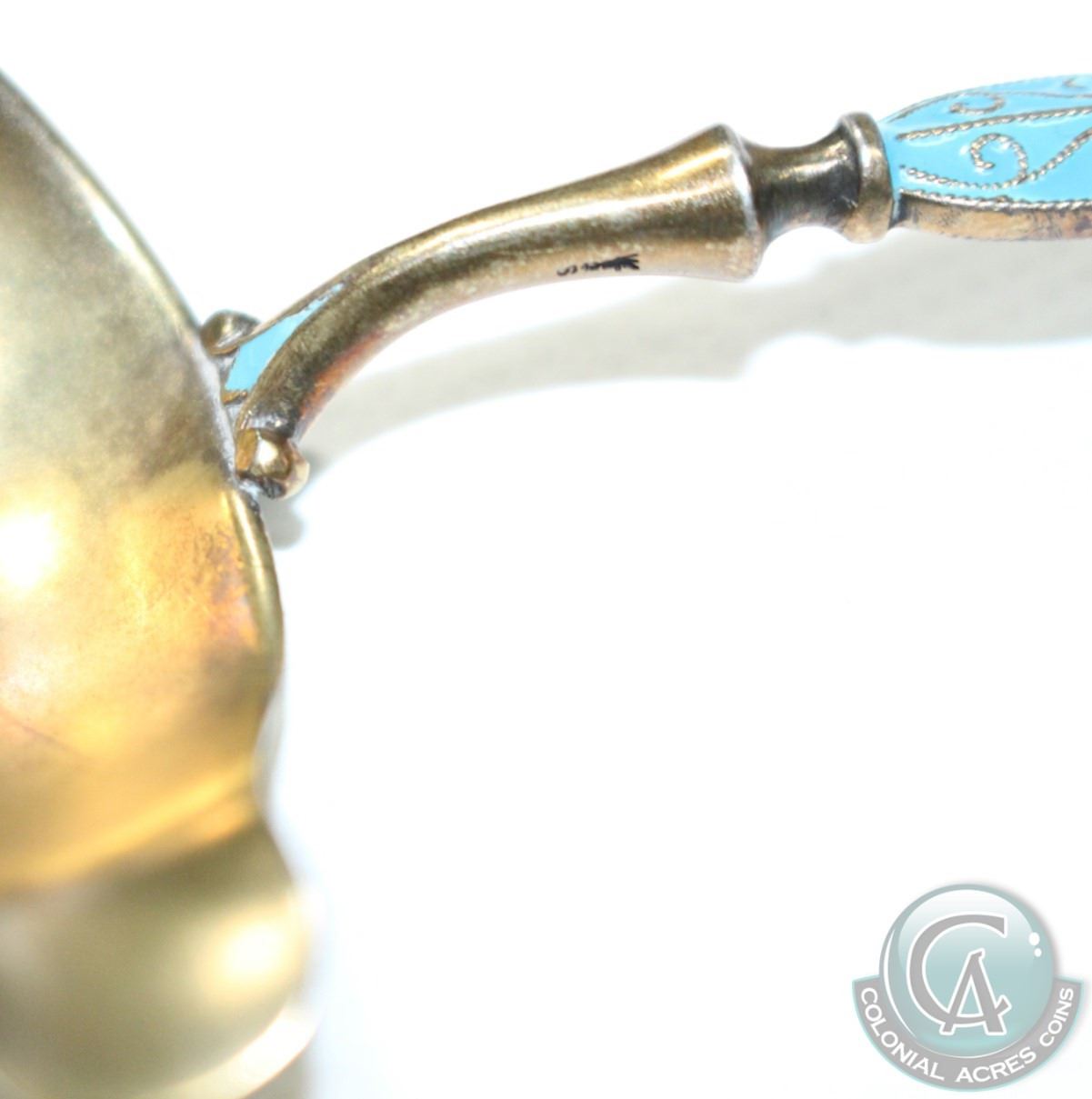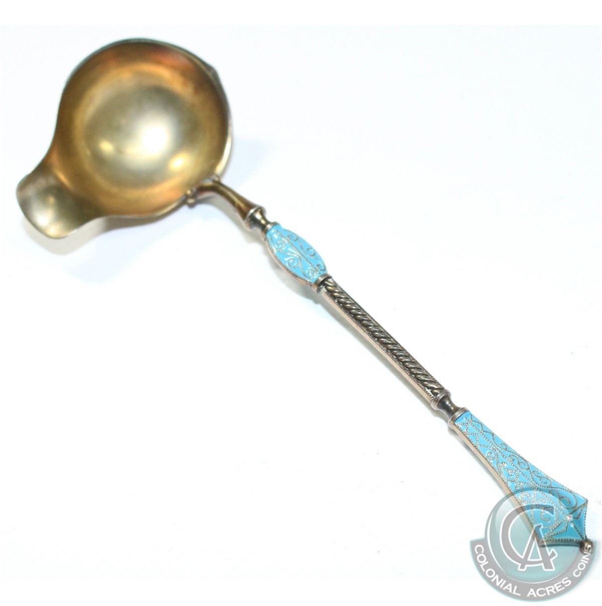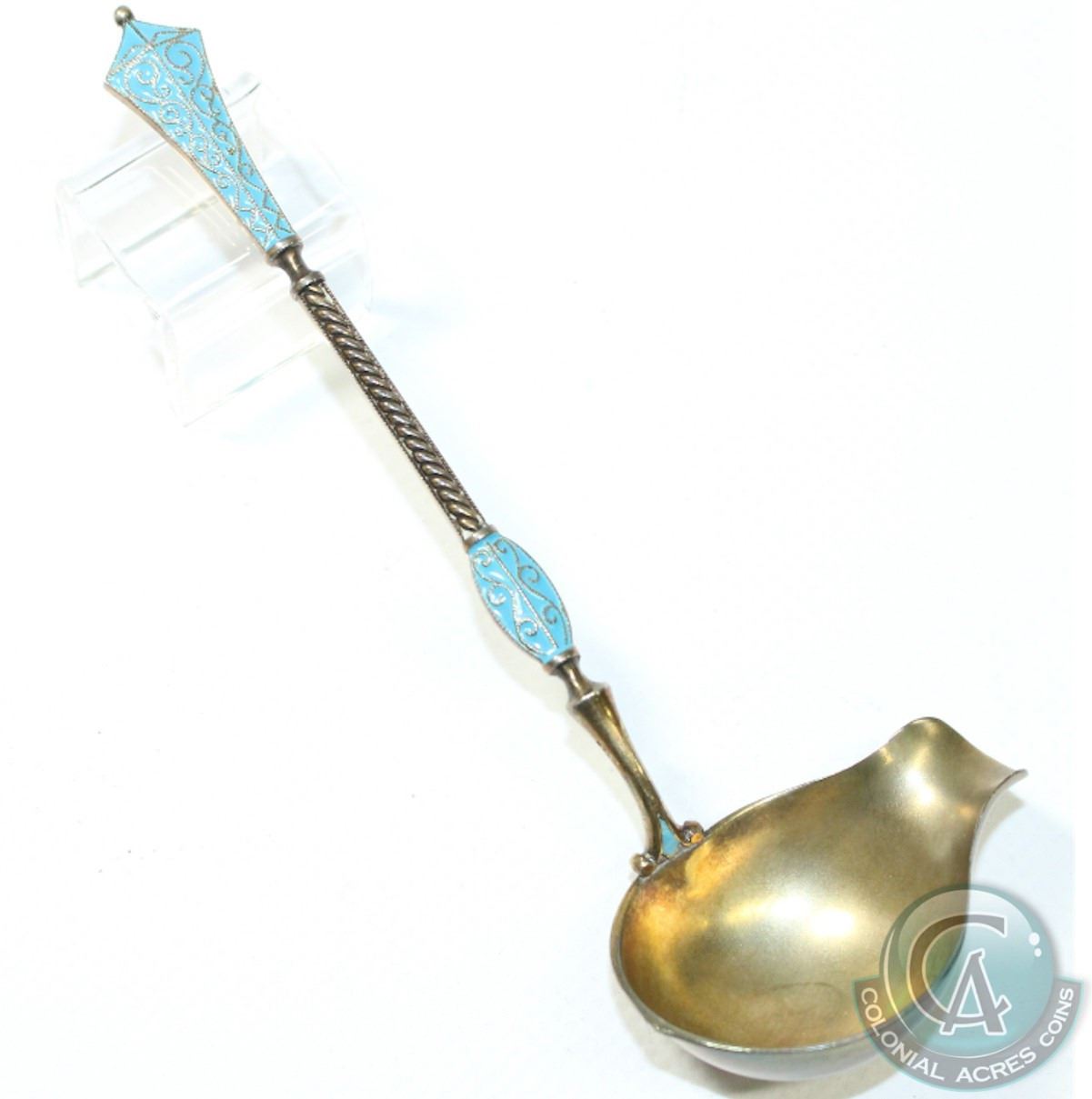 Antique David Anterson 'Norway' Sterling Silver & Enamel Cream Ladle. Item measures 5 1/2" in length with a beautiful scrolling design with Light blue Champlevé Enamel. Total weight of this piece is 26.05 grams.