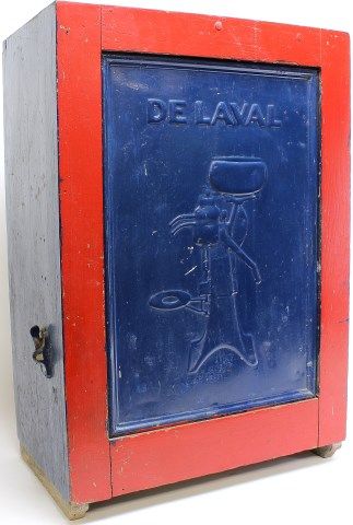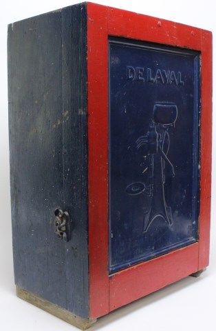 with embossed tin front panel hinging front door, original interior, exterior in blue and red paint, 18" X 26". Est. 250-400