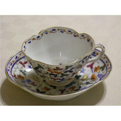 Lovely floral enamel-painted teacup with gold tone trim with a Vienna-type beehive mark at the bottom. There is no crazing, though the gold trim at the edge of the rim is fairly worn. The cup measures 2 inches in height, and the width across the rim is 3 by 2 and 3/4 inches. The elongated saucer measures 4 1/2 by 4 inches, and has an interesting depth of about 3/4 inches.