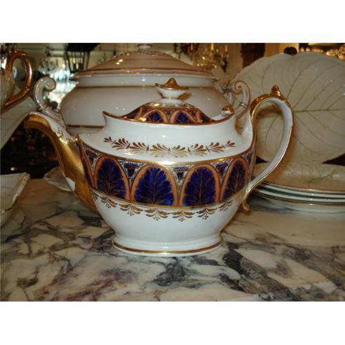 A Beautiful and Vibrant Porcelain Tea Pot, Circa 1840, Made by Derby Porcelain Factories of England. Painted in Vivid Colors of Cobalt Blue and Deep Peach, Accented with fine Gilt Work in a Beautiful Neo-Classical Pattern. The Handle, Spout, Lid and Finial are All In Excellent Condition, No chips, cracks or Breaks. A Wonderful Find in This Beautiful Pattern. Lovely Shape!