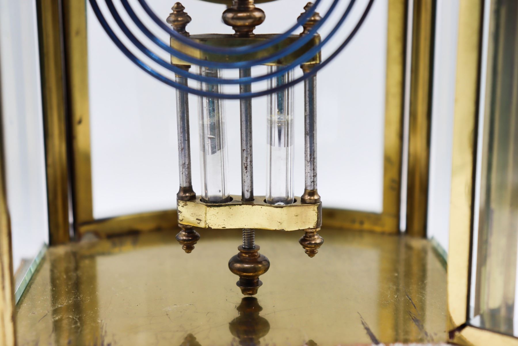 Glass walled desk clock with front opening door and pendulum. Key is included.