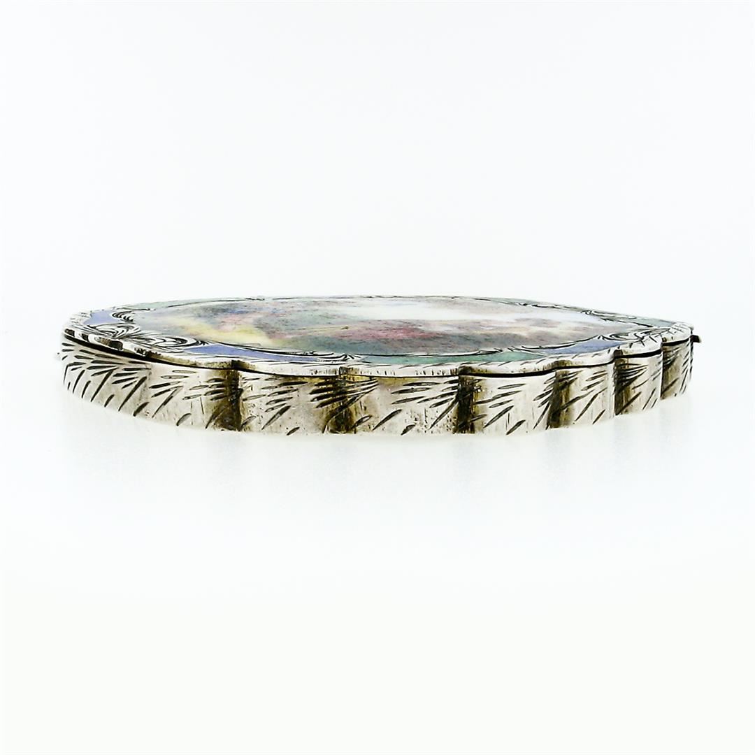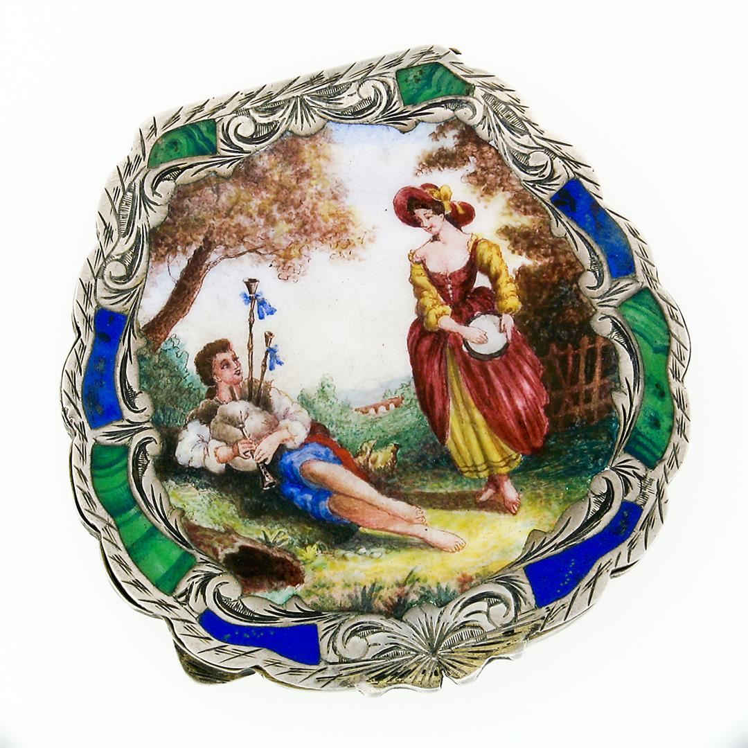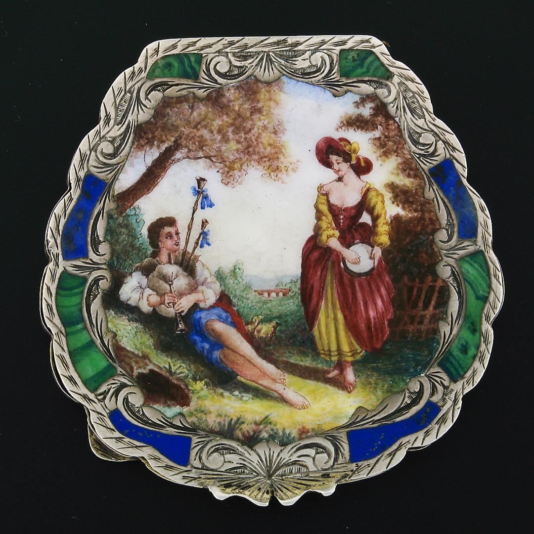 Antique Detailed Enamel Painting Engraved Silver Makeup Powder Shell Shape Box. An antique, solid 800 silver, shell shaped powder compact featuring a detailed painting on the front and fine hand-engraved floral patterns throughout. Measures 79.8x80.5mm an