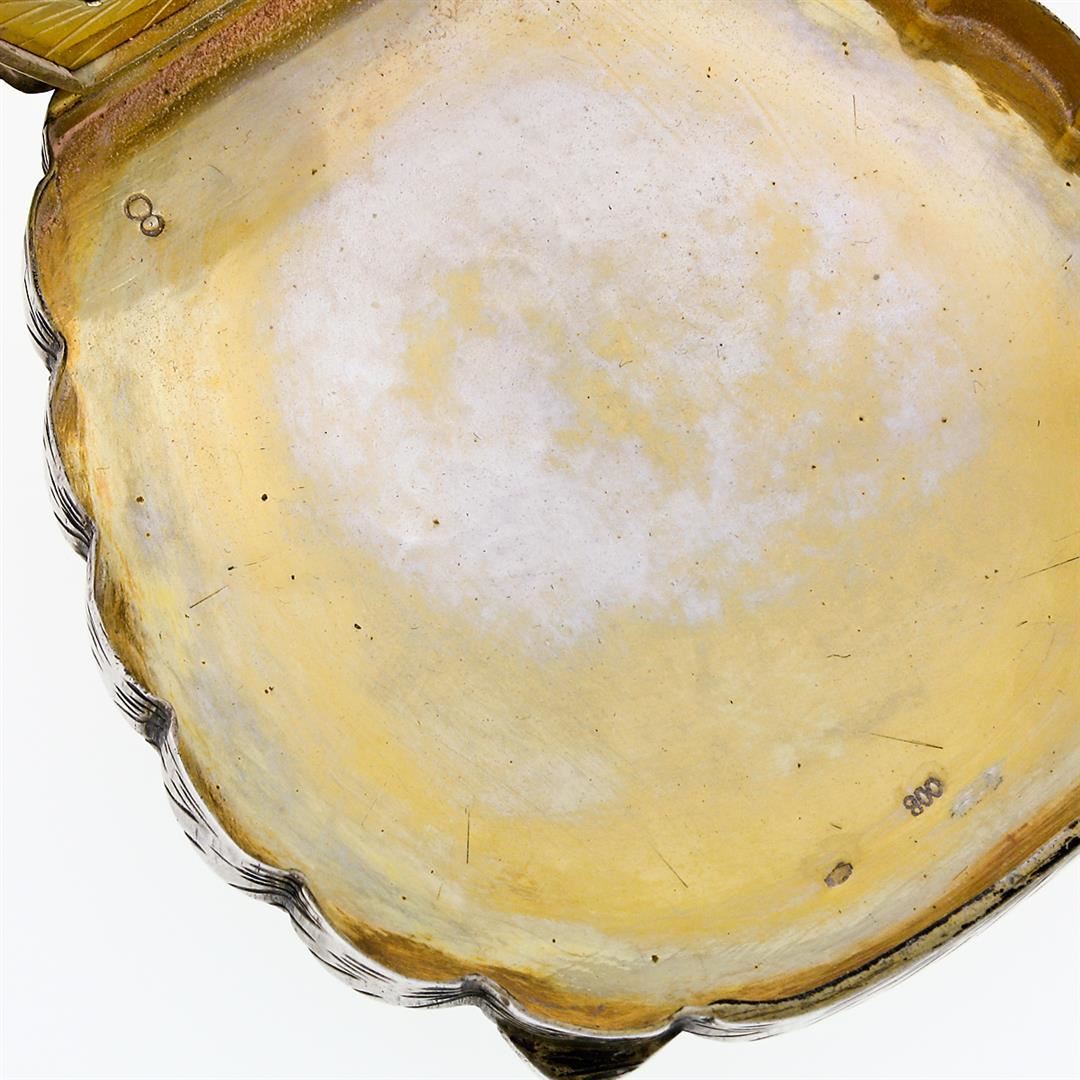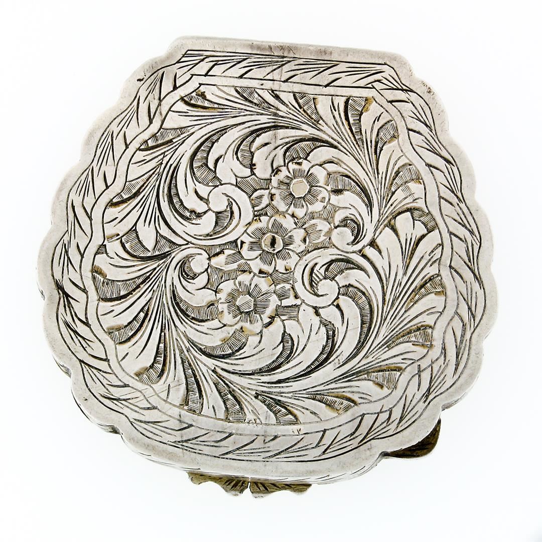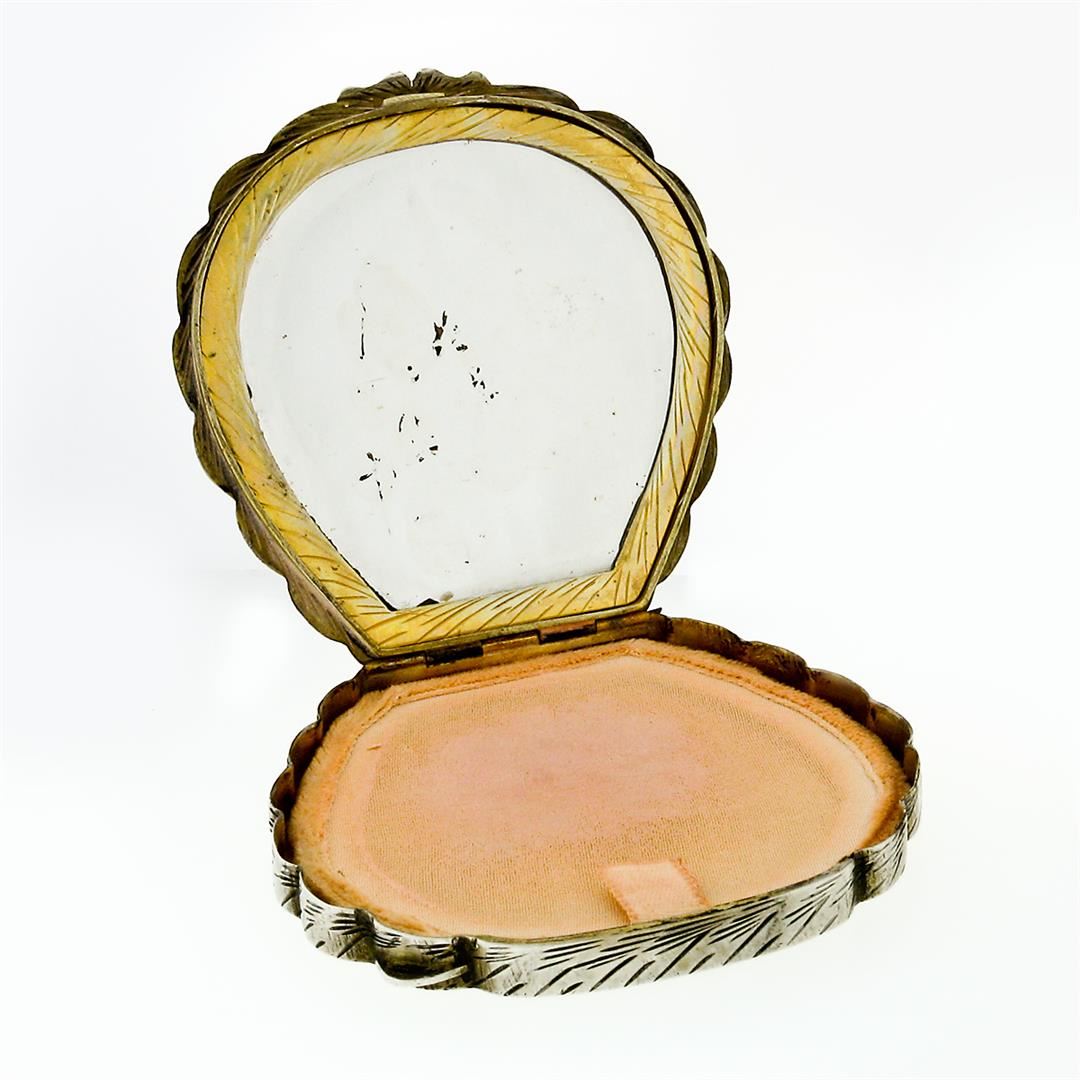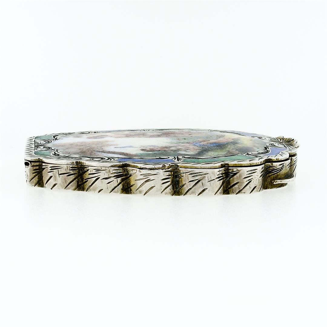 Antique Detailed Enamel Painting Engraved Silver Makeup Powder Shell Shape Box. An antique, solid 800 silver, shell shaped powder compact featuring a detailed painting on the front and fine hand-engraved floral patterns throughout. Measures 79.8x80.5mm an