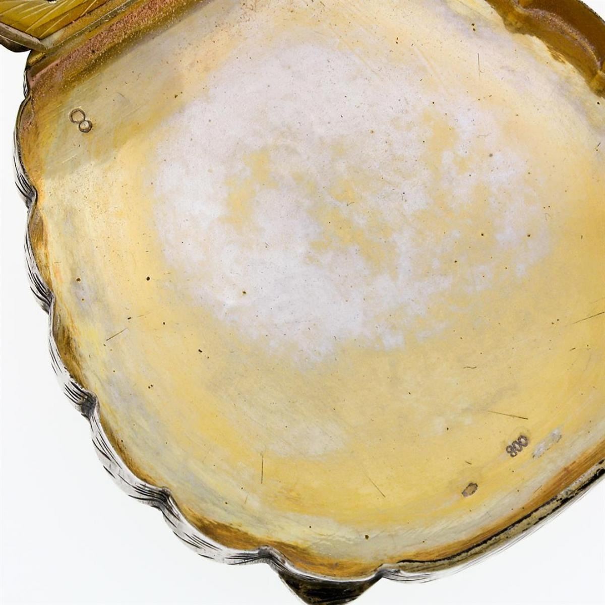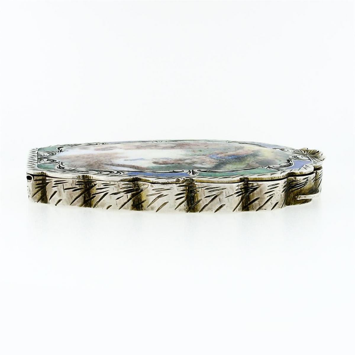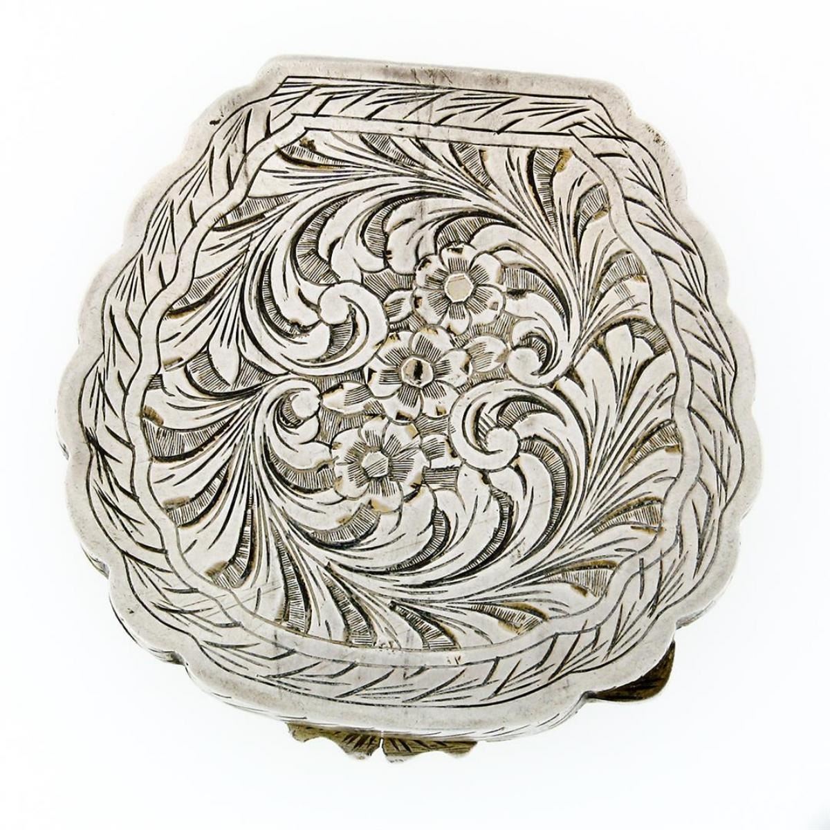 Antique Detailed Enamel Painting Engraved Silver Makeup Powder Shell Shape Box. An antique, solid 800 silver, shell shaped powder compact featuring a detailed painting on the front and fine hand-engraved floral patterns throughout. Measures 79.8x80.5mm and weighs a total of 111.41 grams.