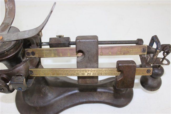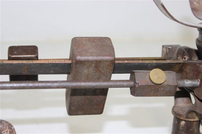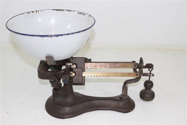 triple beam, 10 lbs, cap 24 lbs, approx size of scale with bowl 13" tall x 18" wide
