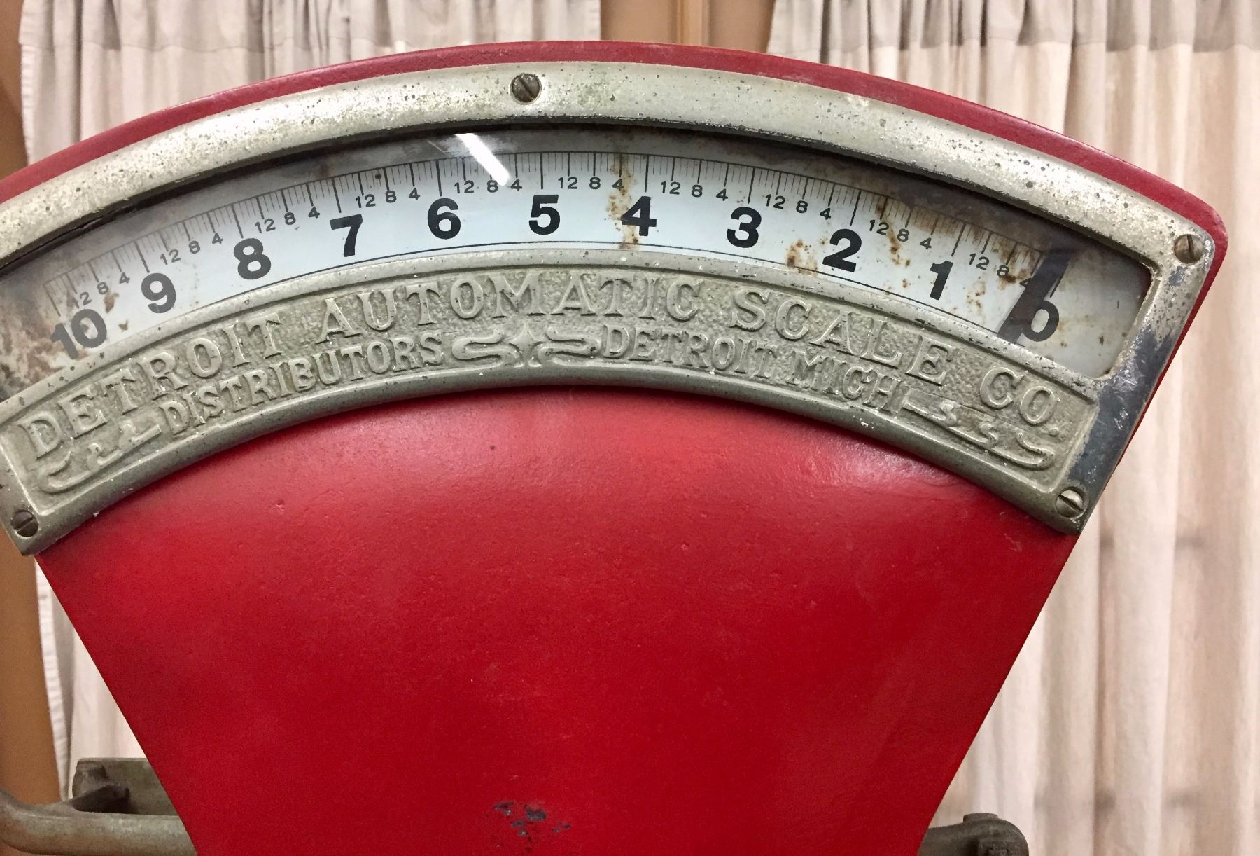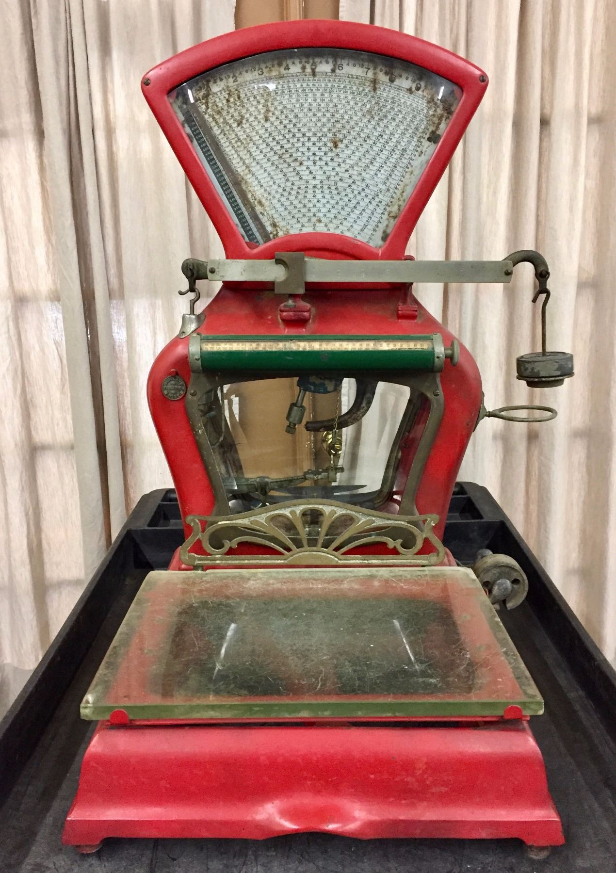 Description: A red, fan top scale with visible central mechanism and glass platform. No. 710055 with latest pat. date on it of 1907. Seems to work, but probably not really accurate. Maker: Detroit Automatic Scale Co. Approx. Age: Circa 1910 - 20s. Size: 19 3/4” l x 16” w x 30 1/4” tall. Condition: Pretty good for its age, wear expected and one of the levelers (feet) is gone. Please look closely at the pictures - they are an important part of our description. Shipping: LOCAL PICK UP ONLY. NO SHIPPING AVAILABLE.
