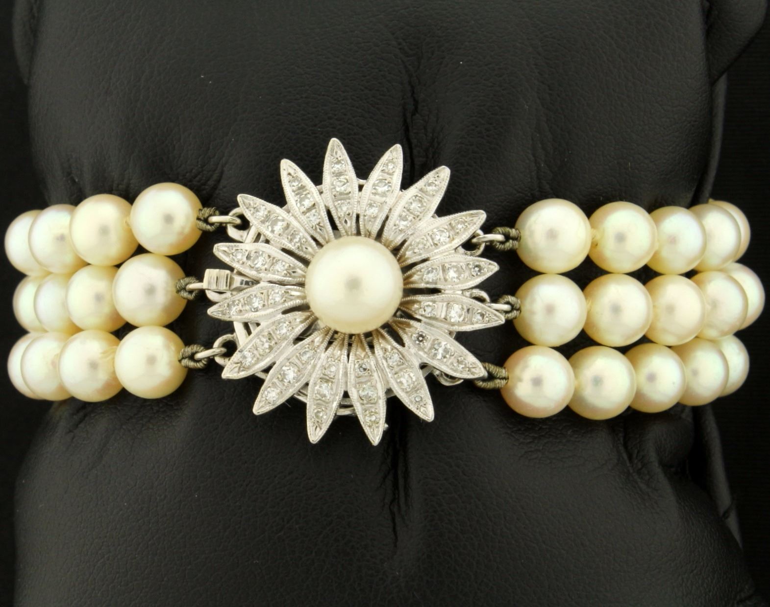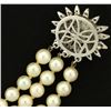 In 14k white gold. Contains 66 high quality natural 6mm pearls with excellent color and high luster and one 8mm high quality pearl on clasp. Clasp also contains 1/2ct TW of high quality diamonds of VS clarity/H color. 7" long with safety clasp. 31.3g.