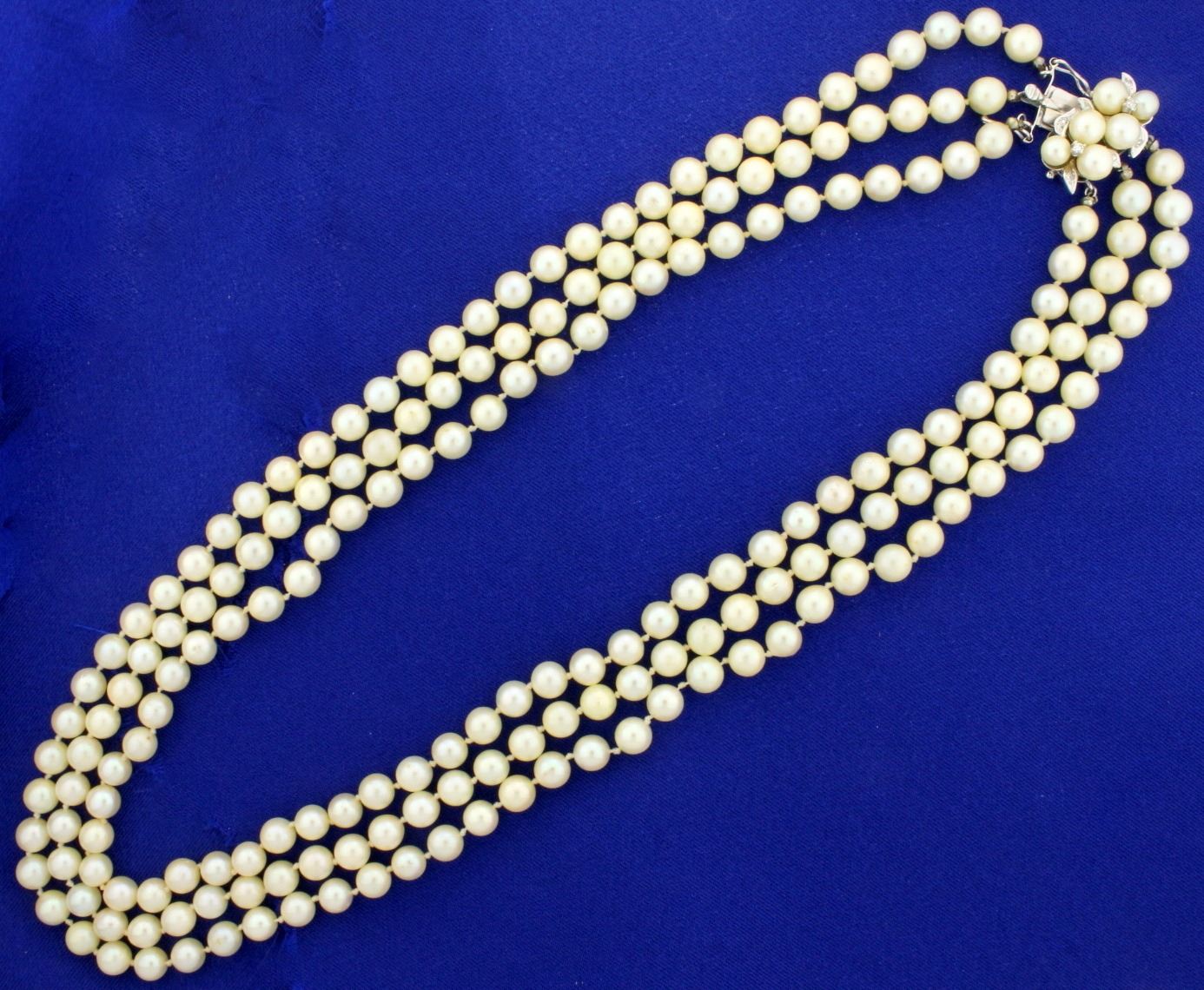 In 14k white gold. Containing 204 high quality 6.5mm natural akoya pearls with excellent color and luster. Also contains two .02ct and six .01ct high quality diamonds of VS clarity/H color. 20 inches long. 91.2g.