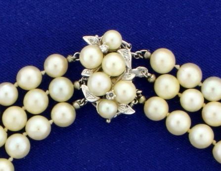 In 14k white gold. Containing 204 high quality 6.5mm natural akoya pearls with excellent color and luster. Also contains two .02ct and six .01ct high quality diamonds of VS clarity/H color. 20 inches long. 91.2g.