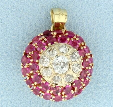 In 14K yellow gold, the pendant is 1 inch long. It contains one 1/3ct and eight .05ct old mine cut diamonds, SI to I1 clarity/H to I color. Also contains 2cts of 2.5mm rubies, that have nice color and clarity. 6.2g