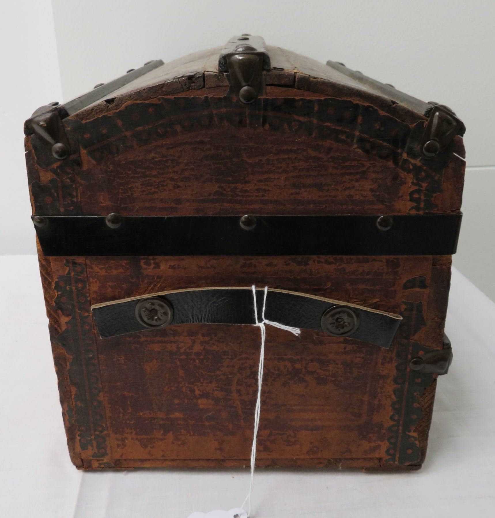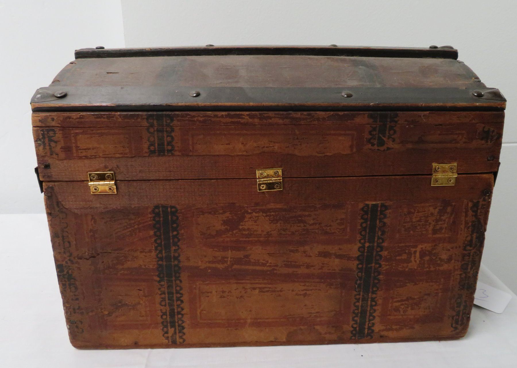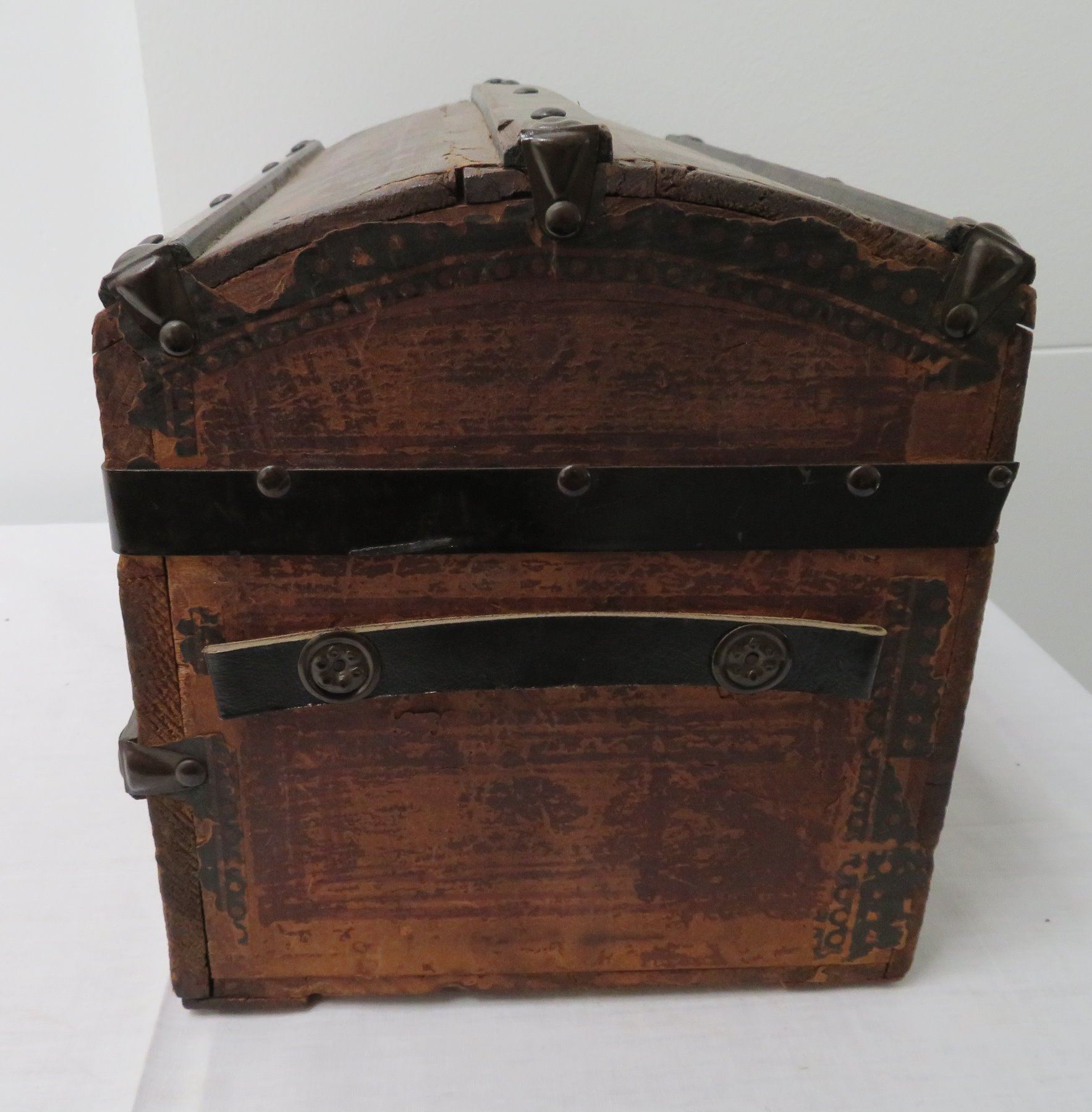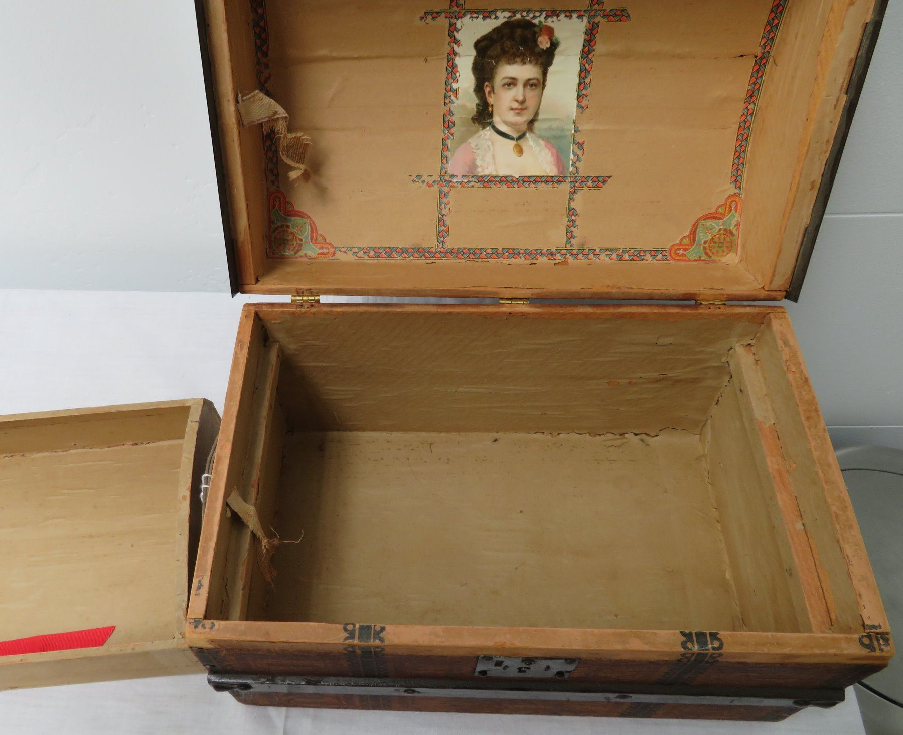 Antique Doll Trunk, c. 1900. Made of wood, paper and steel, the item measures 14" x 10". USA. Nice photo inside lid. Condition: Good, see images. Shipping: $45.00 USA estimate only, w/insurance and signature.