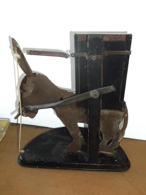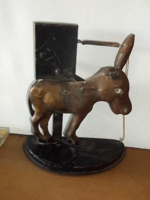 Swartz Mfg. Co. Toledo Ohio stamped on bottom donkey missing one ear, Pull donkeys ear and tail comes up and dispenses cigarette