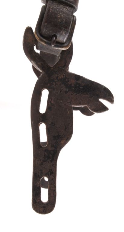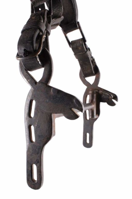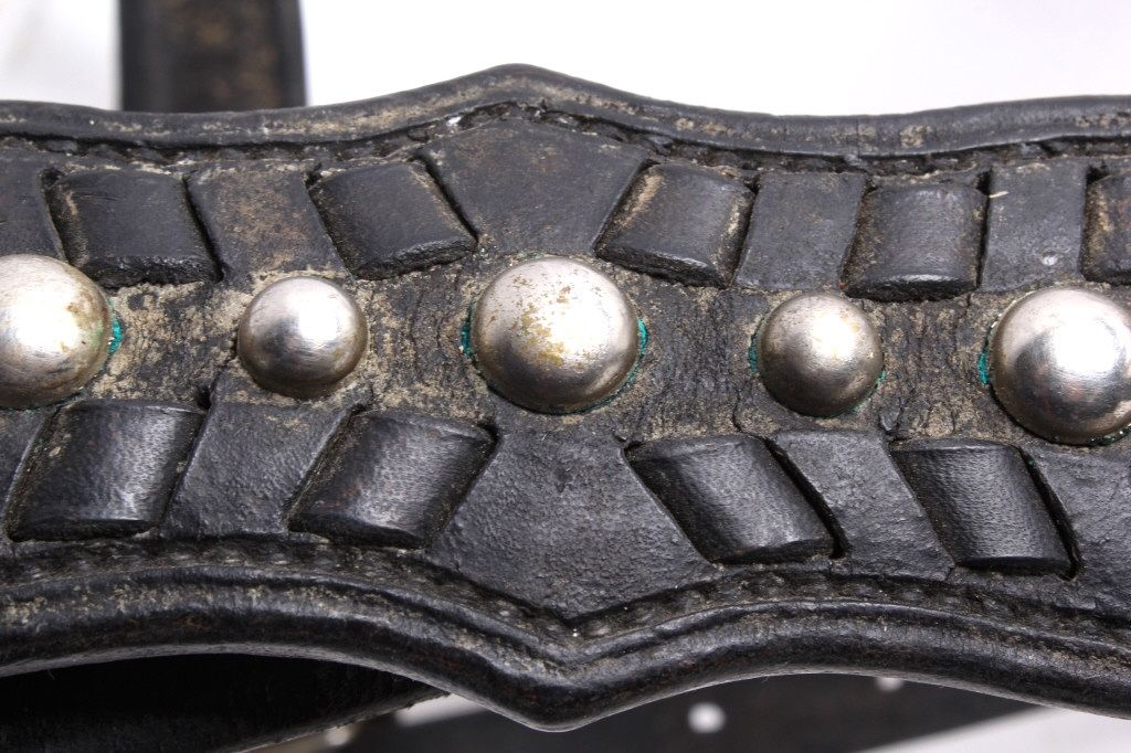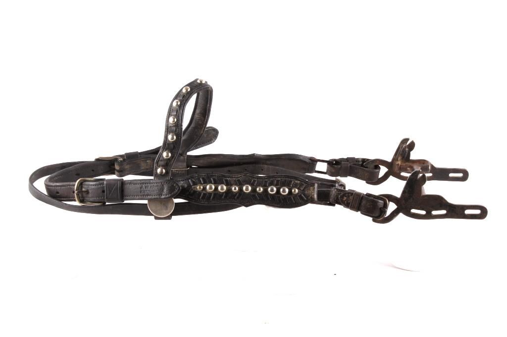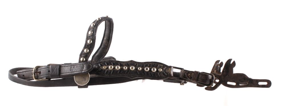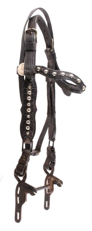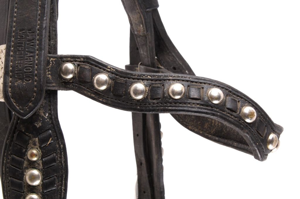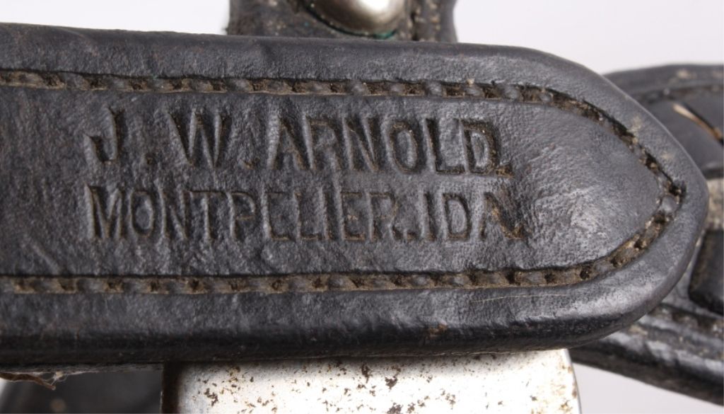 The lot features an donkey driving team horse bit and halter. The halter shows a tooled design with silver studs and silver plated spots. The halter is also marked, "J.W. Arnold Montpelier. Idaho". The bit is forged and shows donkey heads on either side. Bit measures 7.25"x8.5"x3.5"