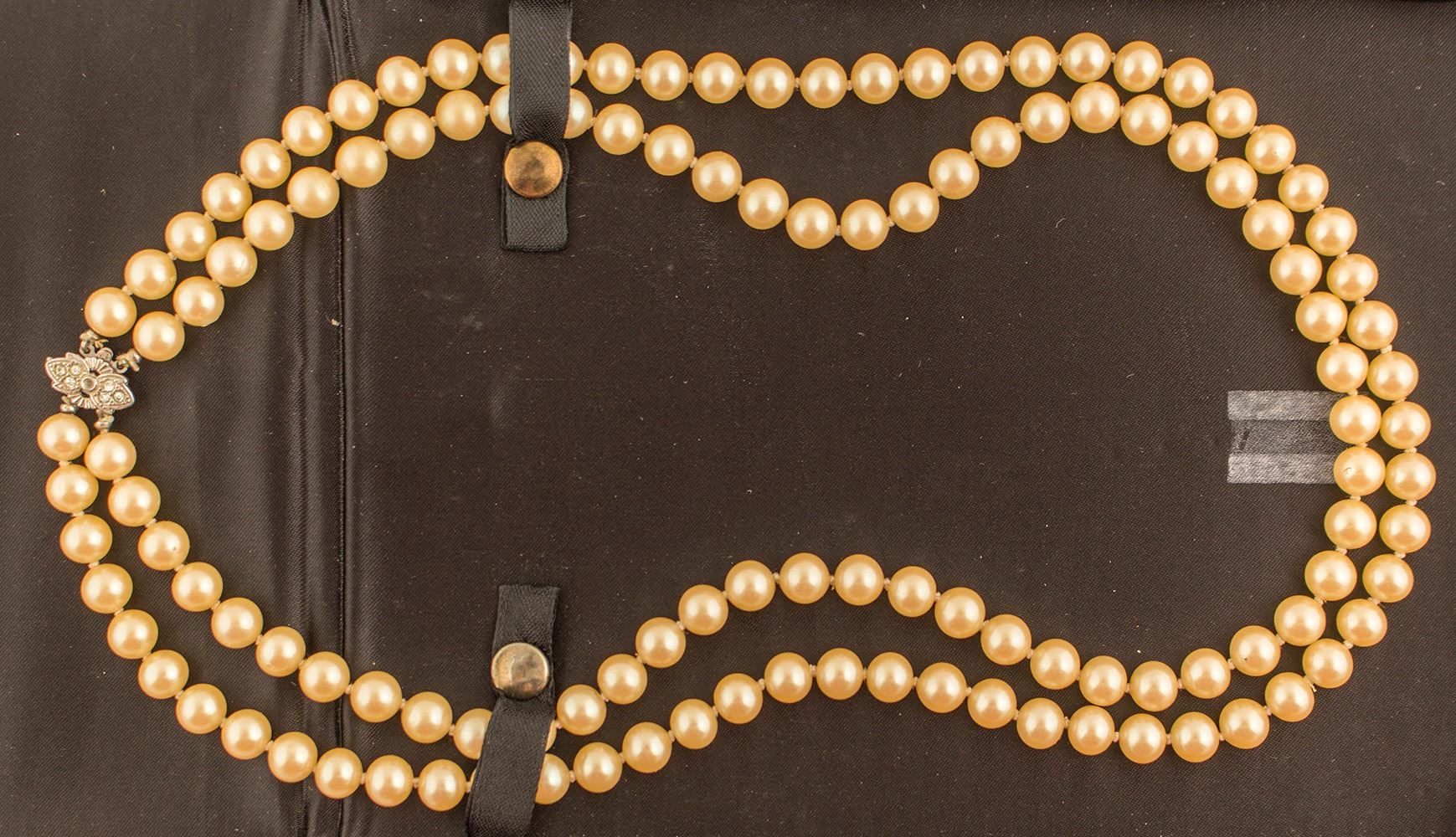 Antique double strand of uniform knotted cultured pearls (7.5mm), platinum clasp set with 6 diamonds, center diamond missing. Early to Mid 20th Century. 21" long. 51.35g. In original satin lined case. Date: Location: HWAC # 52769