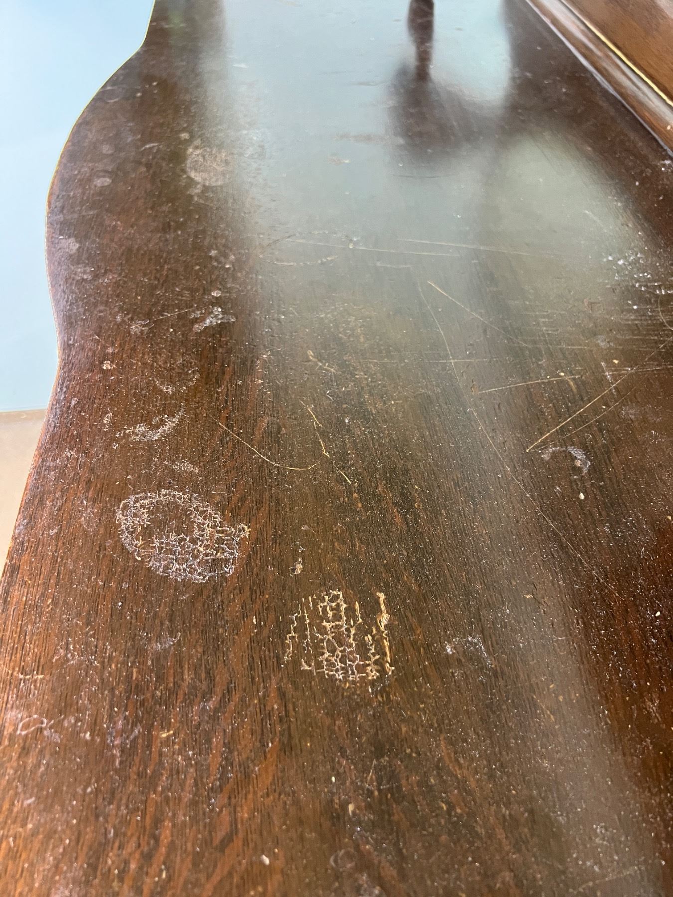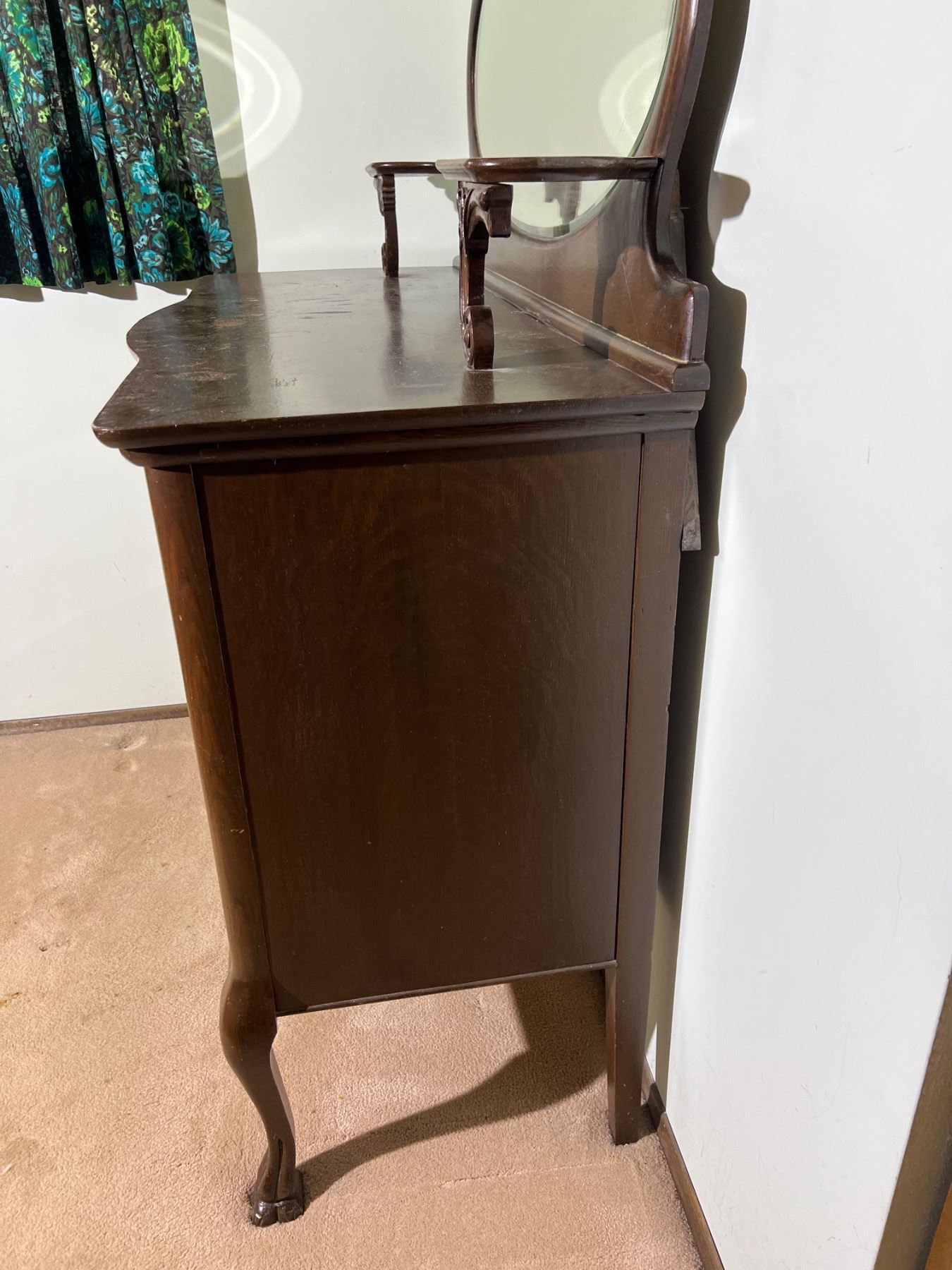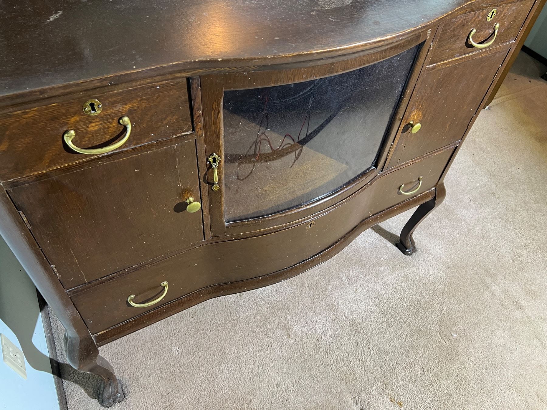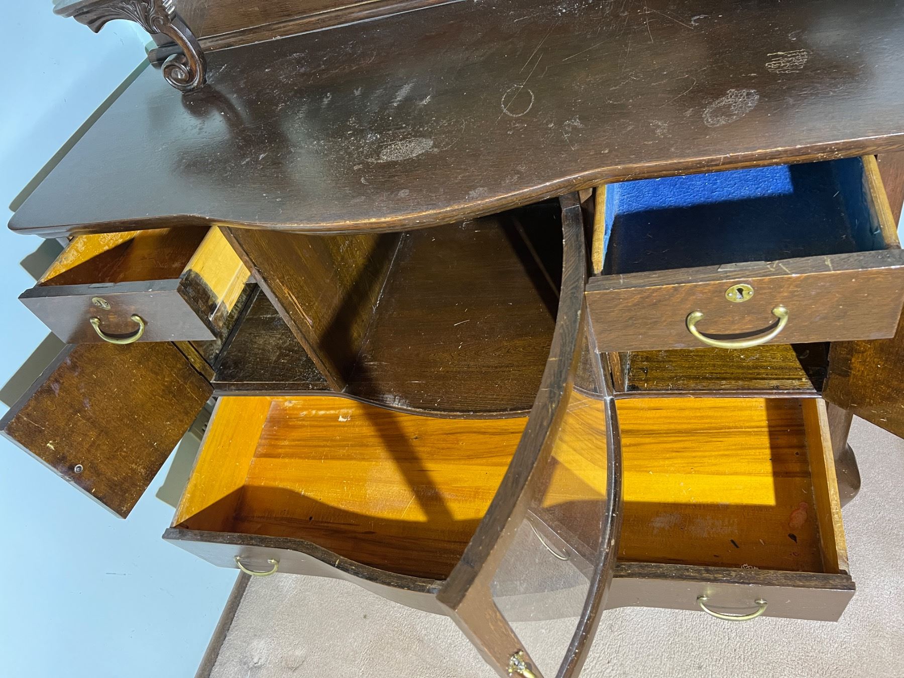 The decorative shelf on the left side is not fully attached but can be repaired, wood has some scuffs and wear, Felt lining is worn on the top right drawer, no keys,