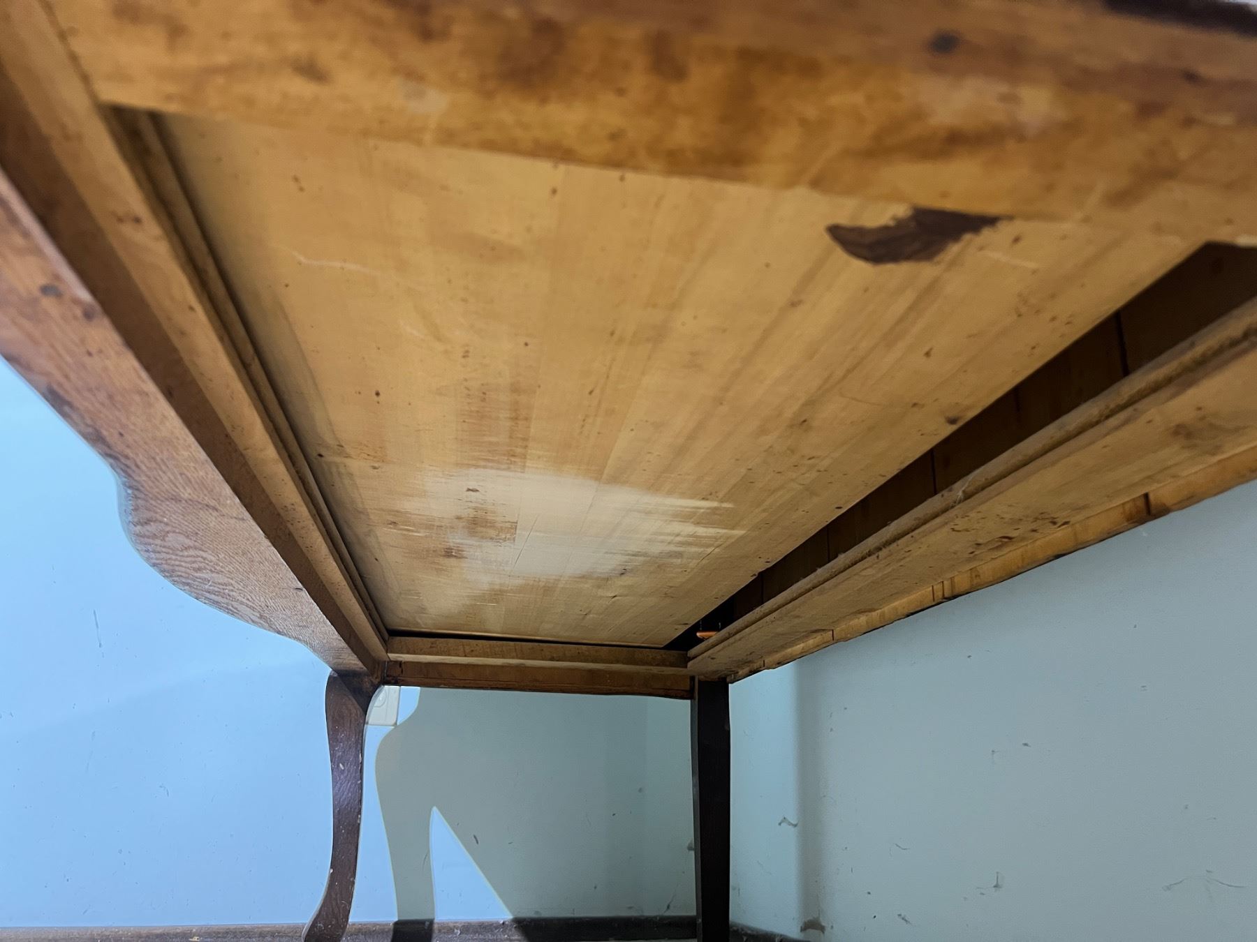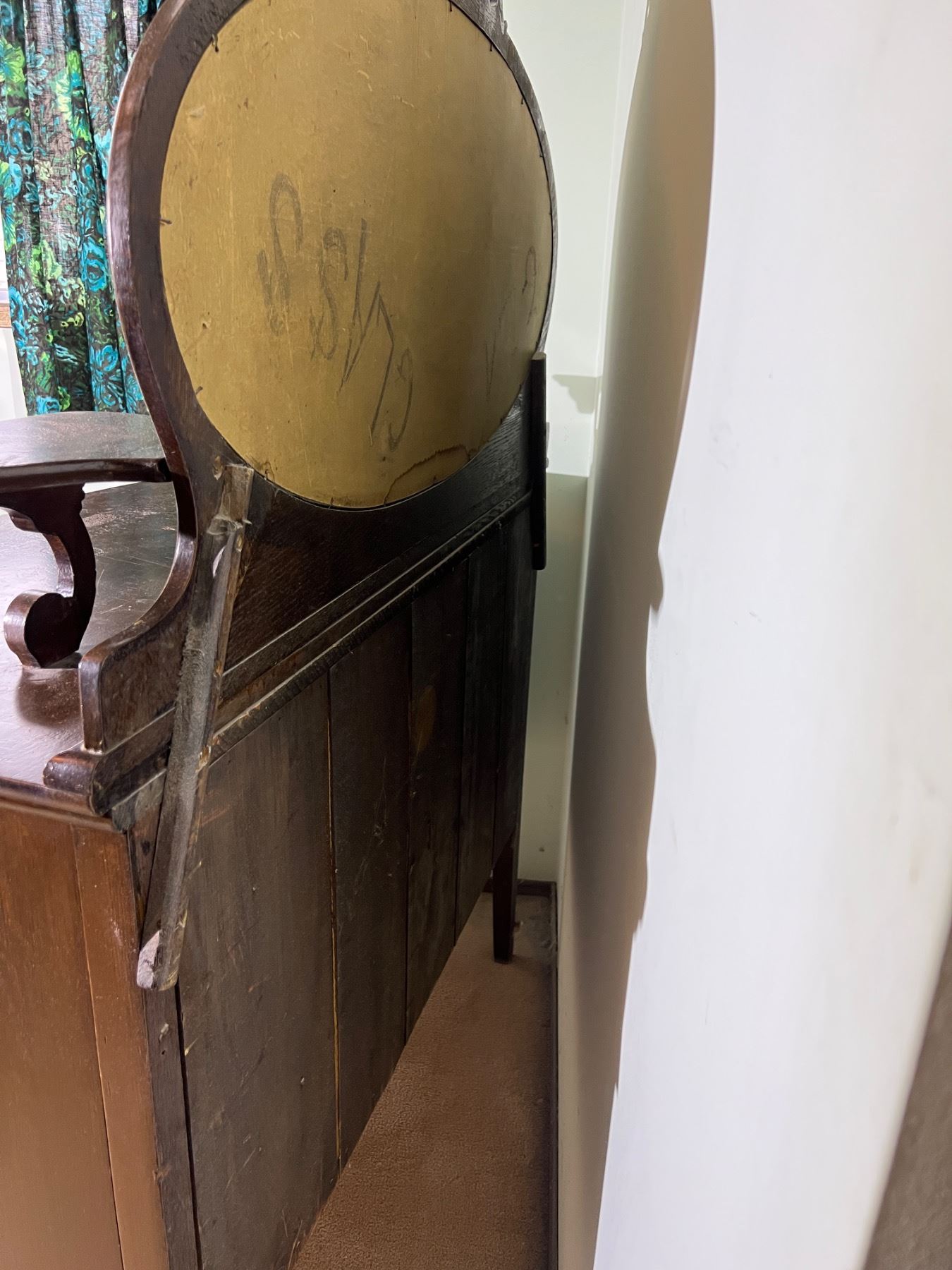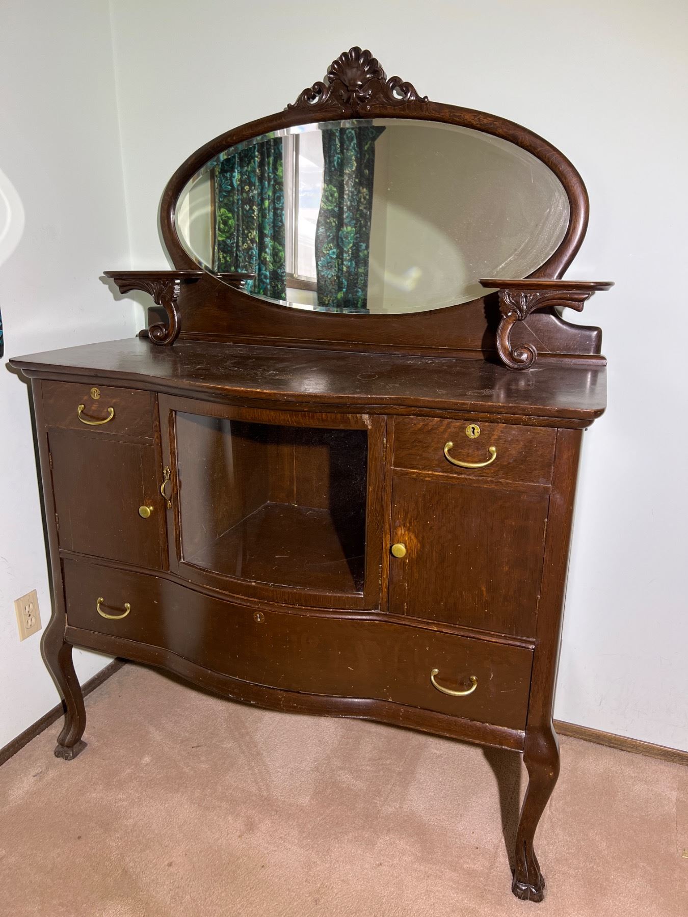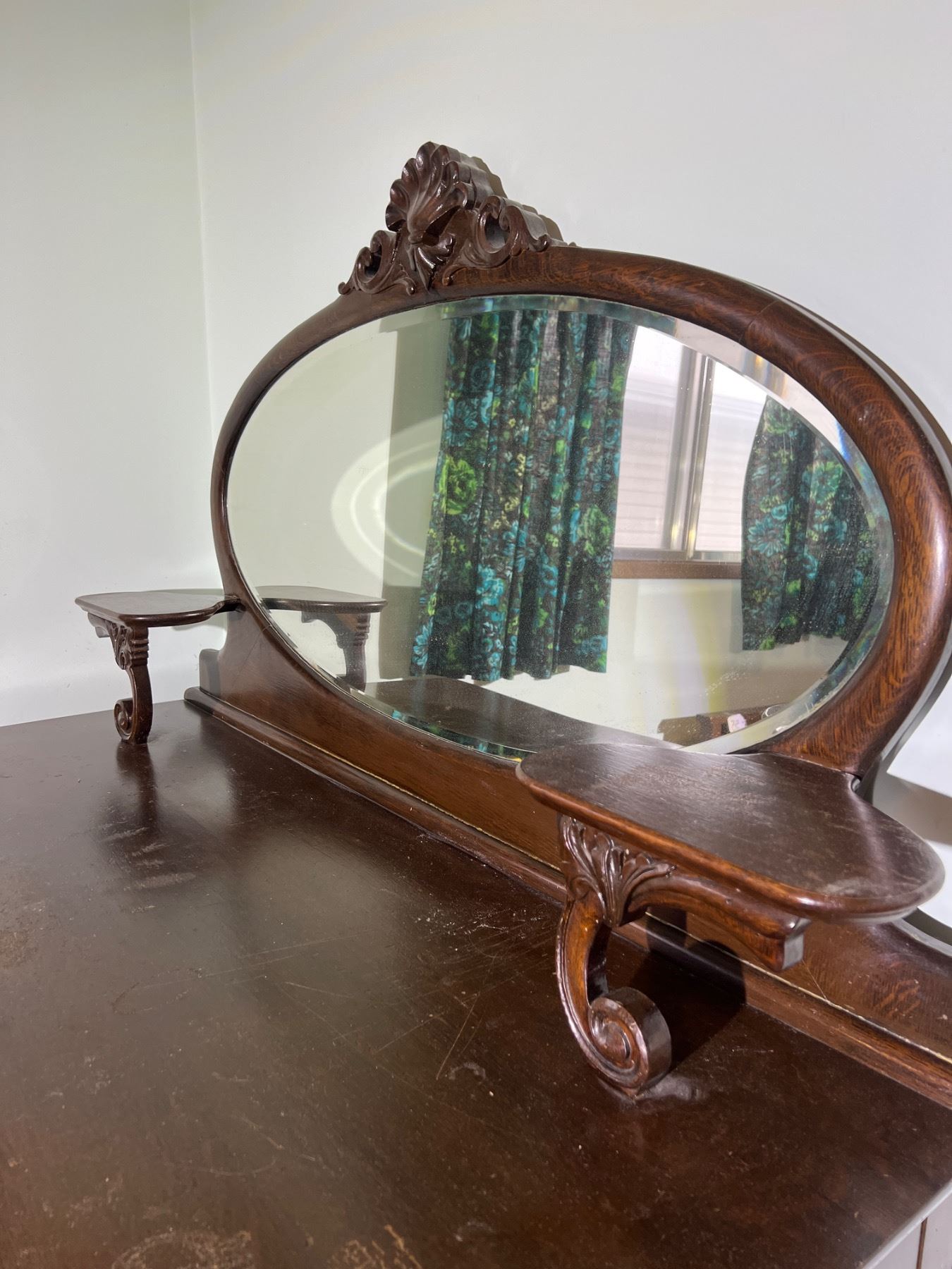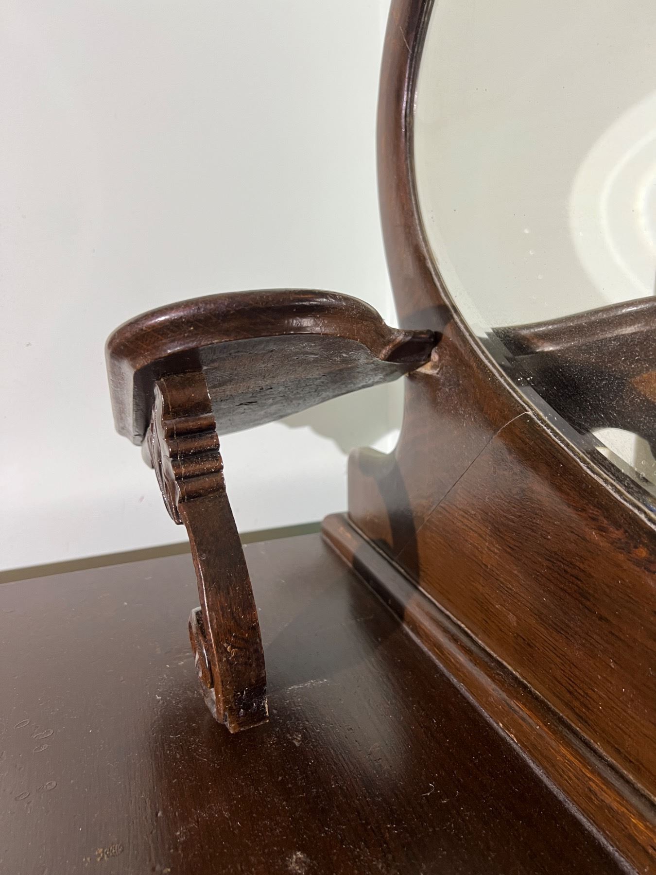 The decorative shelf on the left side is not fully attached but can be repaired, wood has some scuffs and wear, Felt lining is worn on the top right drawer, no keys,