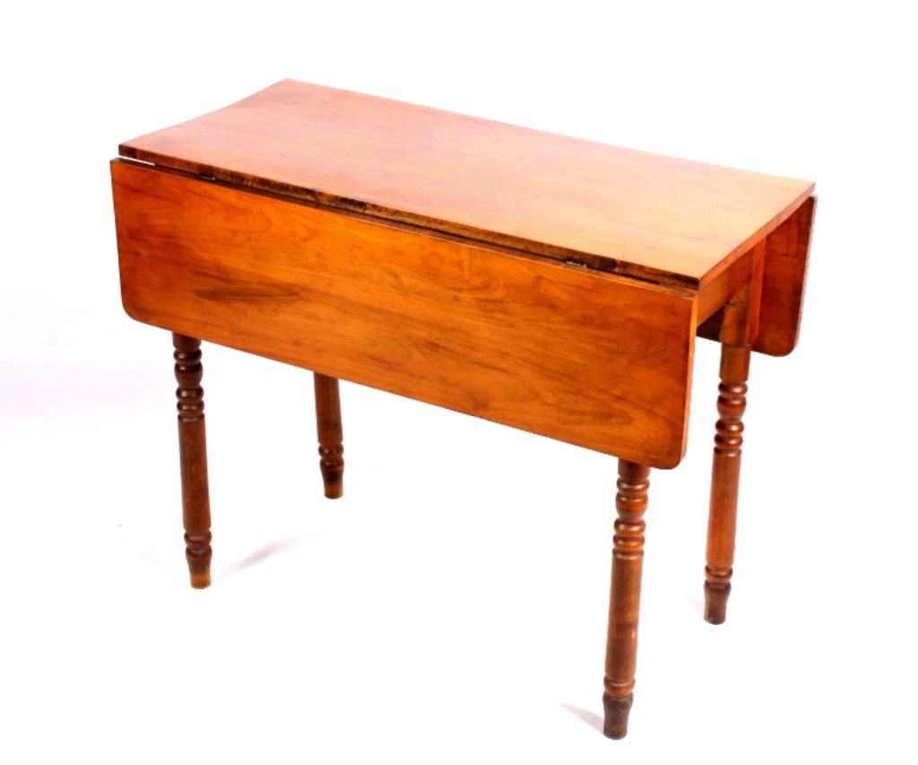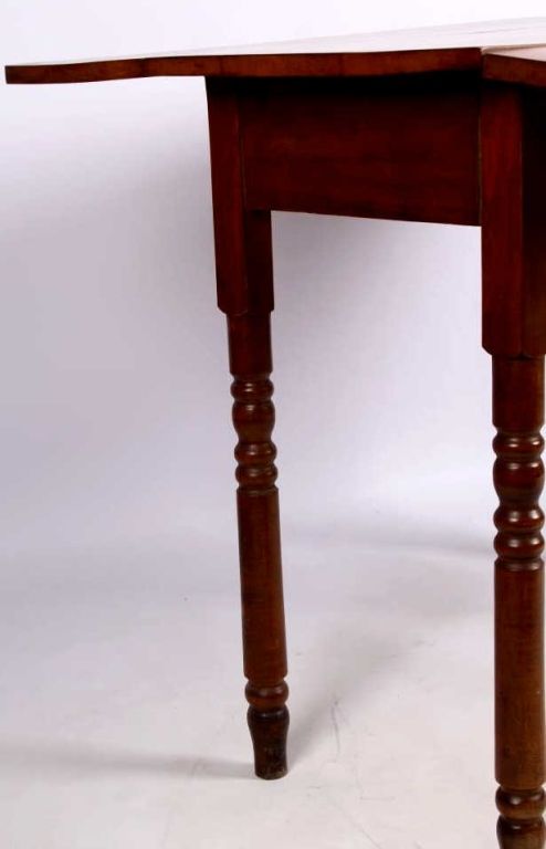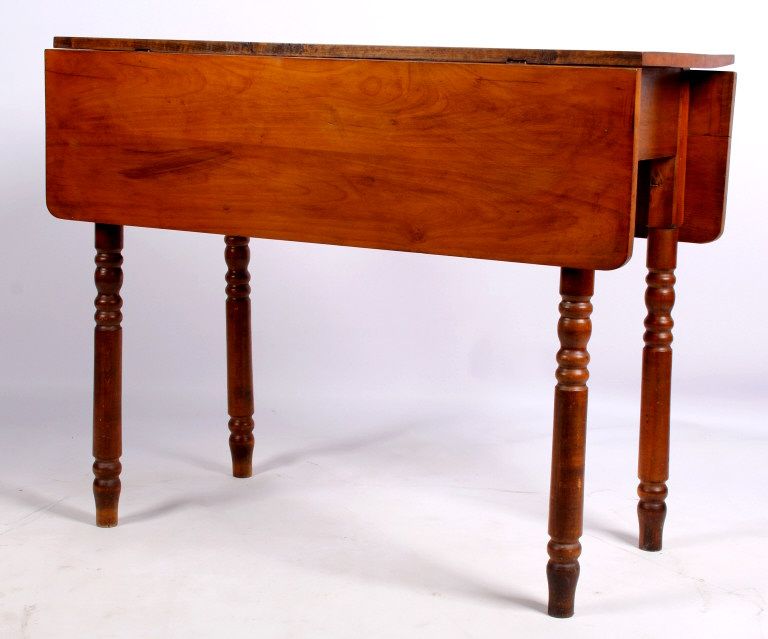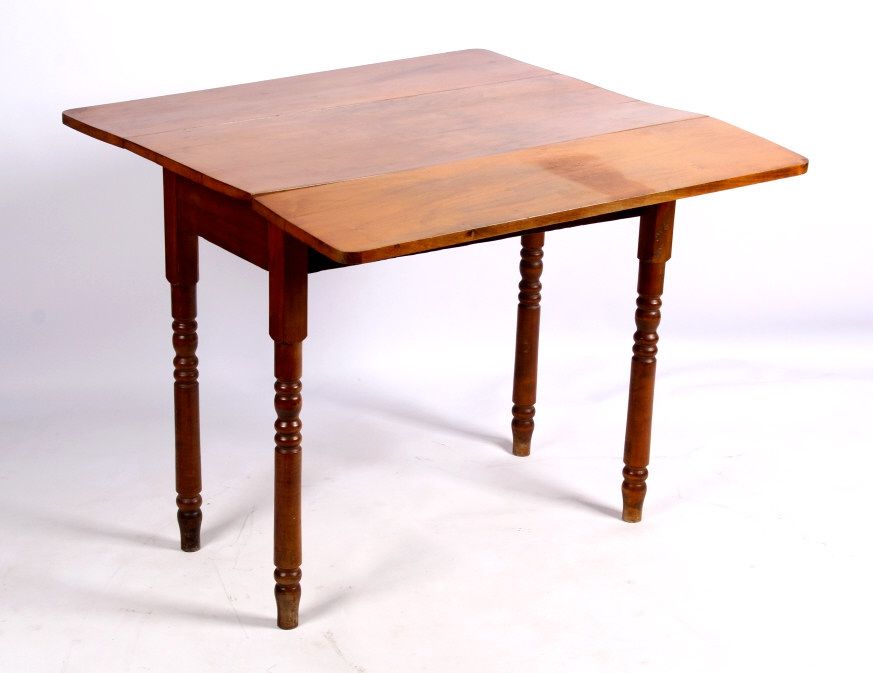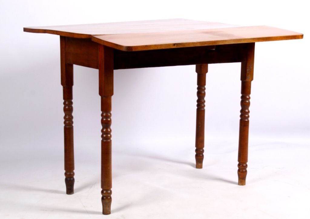 This lot features a drop leaf table. It is in very good condition with a reddish brown finish. With the leaves extended, it is 29.25" x 36". When the leaves are dropped, it is 16" x 36".