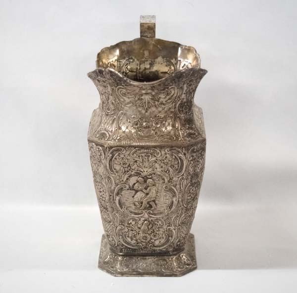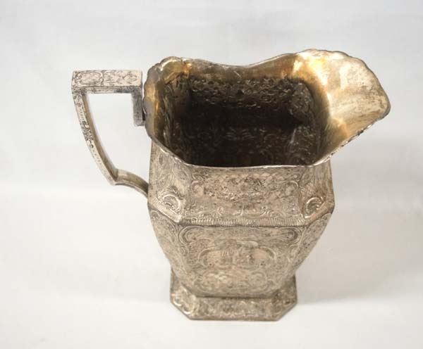 Antique E.G. Webster Silverplate Repousse Pitcher, measures 9'' x 9.5'', very ornate, FYI: ''E.G. WEBSTER & SON - New York and Brooklyn. Founded in 1860 by Elizur G. Webster. Formed E.G. Webster & Brother in 1865. Incorporated in 1867 as Webster Manufacturing Co. Sold to the International Silver Co. in 1928.''