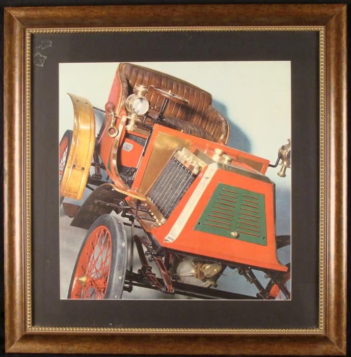 This is a large photo print of an antique car. It shows off the details well, including the grill, and wooden fenders. Medium: Photograph Image size: 19 x 19 1/2 inches Framing: Matted in black, in wood frame with gold painted beaded border Frame size: 28 x 28 1/2 inches Condition: very good; some slight nicks to the frame This is a great classic auto picture for your home or garage.