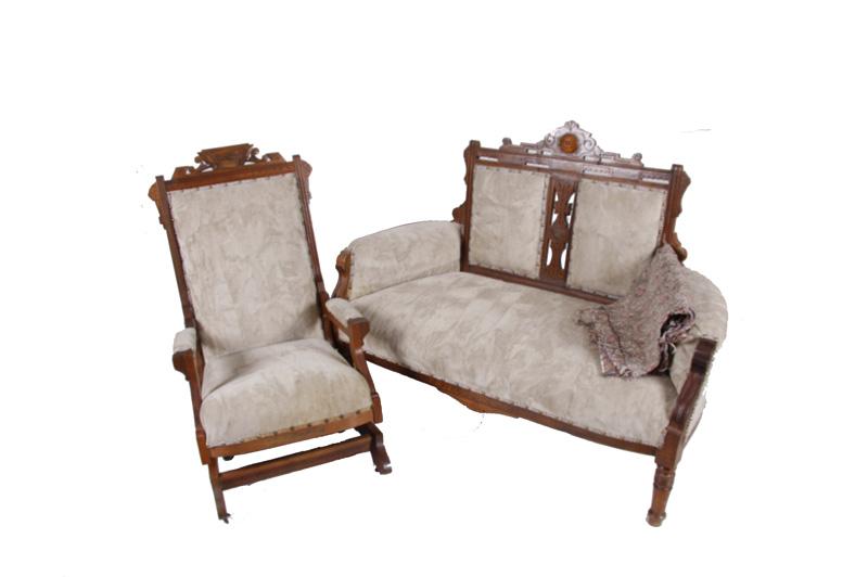 Antique Eastlake Settee with Matching Rocker Both have tan velour upholstery, settee measures 55"x38