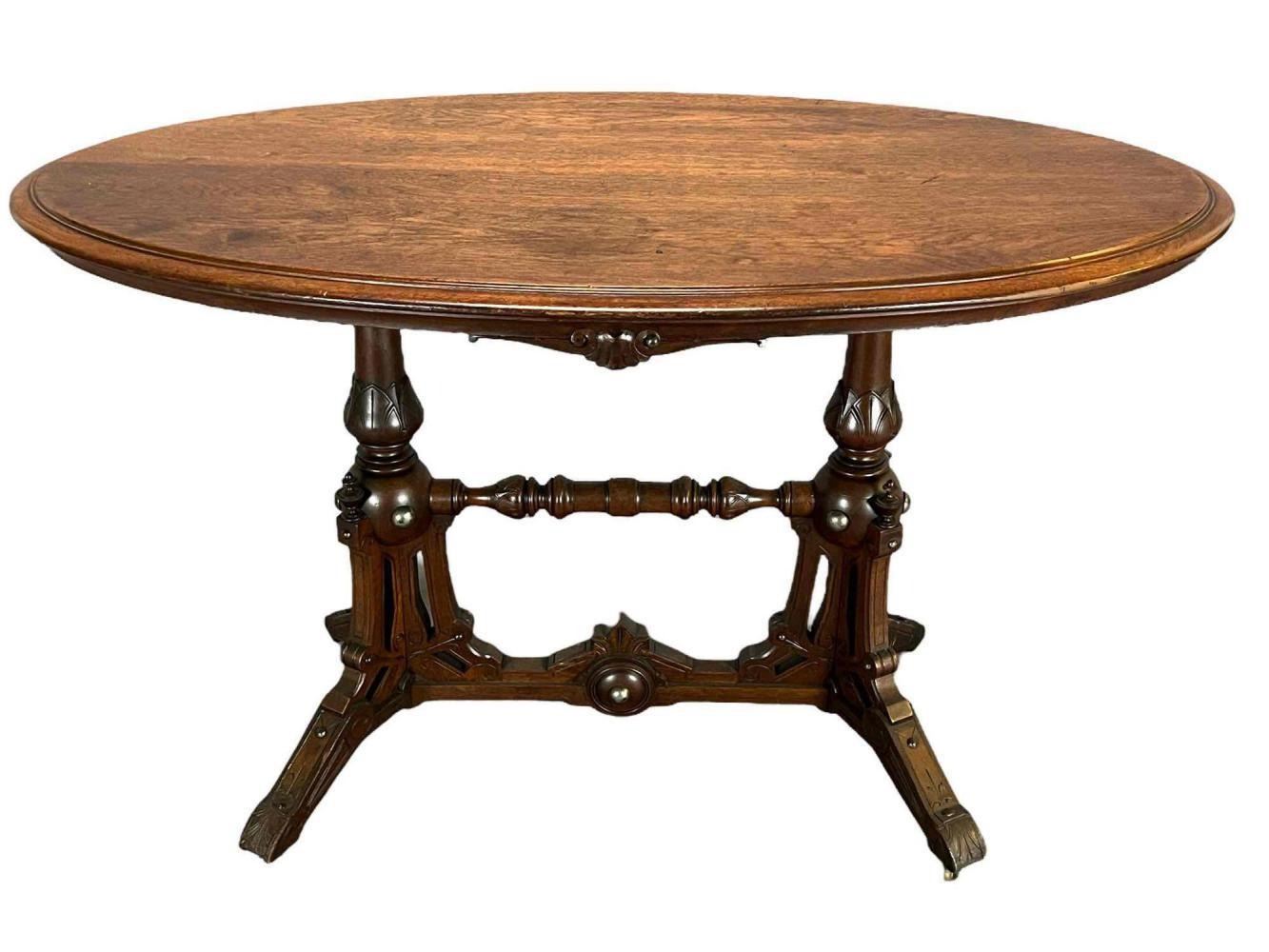 Antique Eastlake Victorian Parlor Table With Ornate Carving And Metal Accents. Approximately 47W x 29.125H x 27D in.