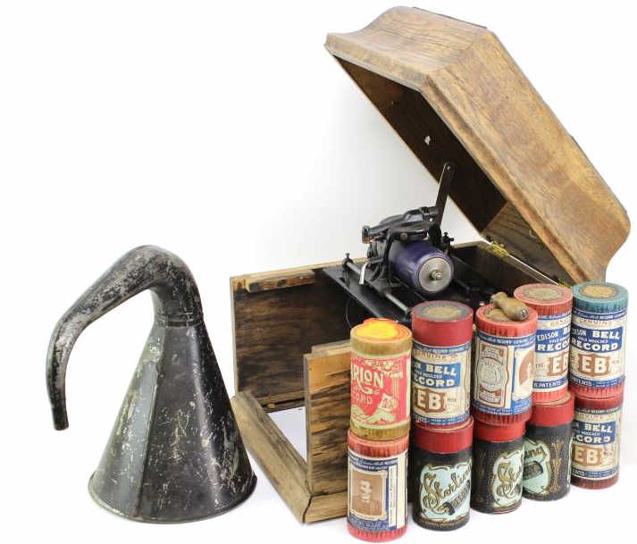 Antique Edison Cylinder Player fully functioning having seen better days, includes 10 cylinders.