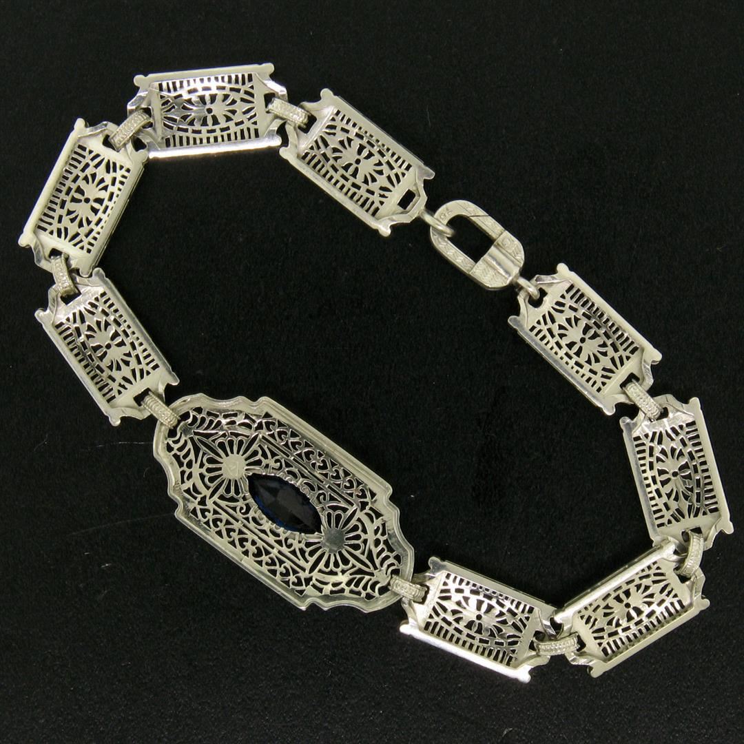 Antique Edwardian 10k White Gold Filigree Link Bracelet w/ Marquise Sim Sapphire