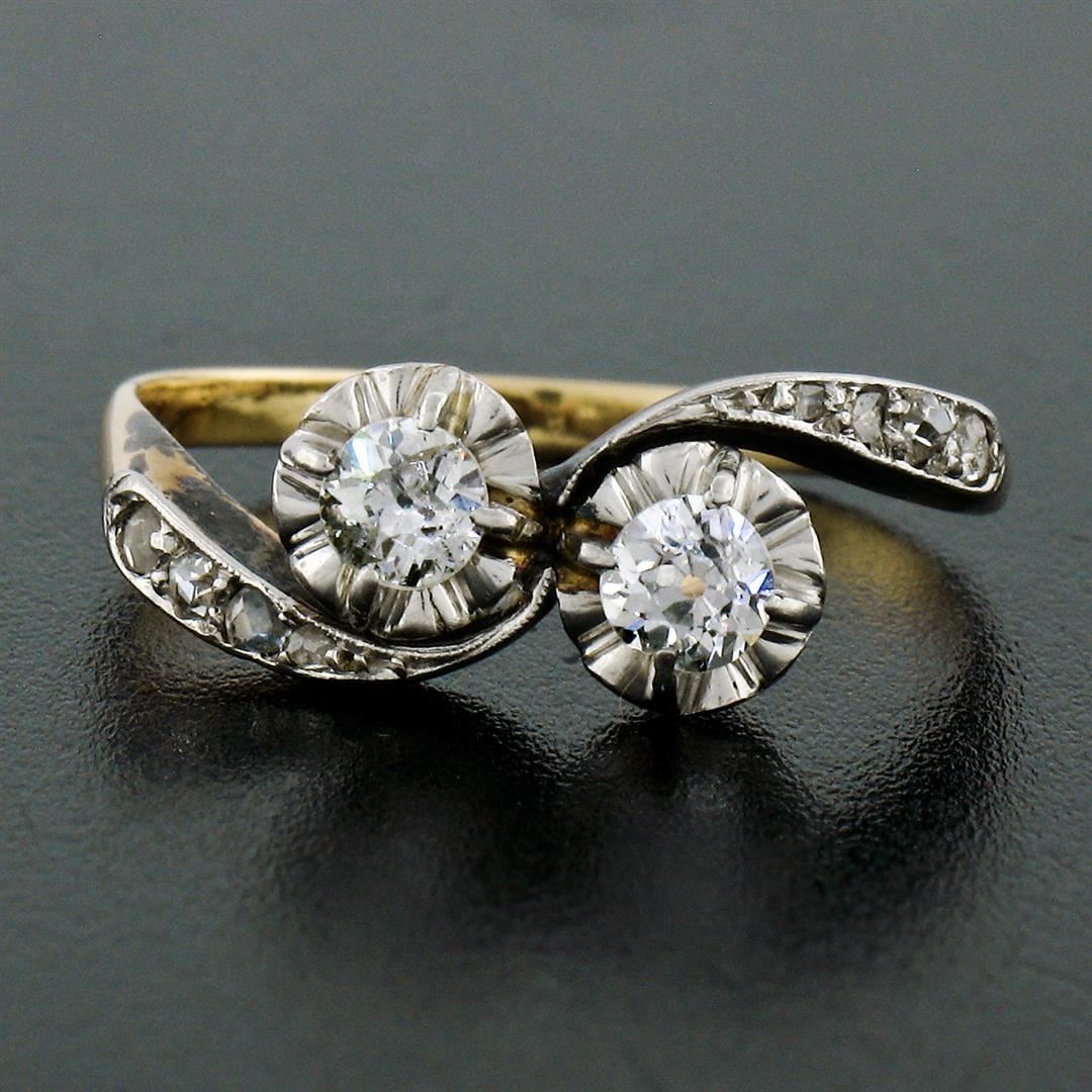 An antique solid 14k yellow gold and platinum top bypass ring, featuring 2 old european cut natural diamonds (G/H - SI1/SI2; 0.42ctw). and 8 rose cut natural diamonds (G/H - SI1/SI2; 0.12ctw). The ring is size 7,0, weighs a total of 2.49 grams, and measures 7.30mm wide.