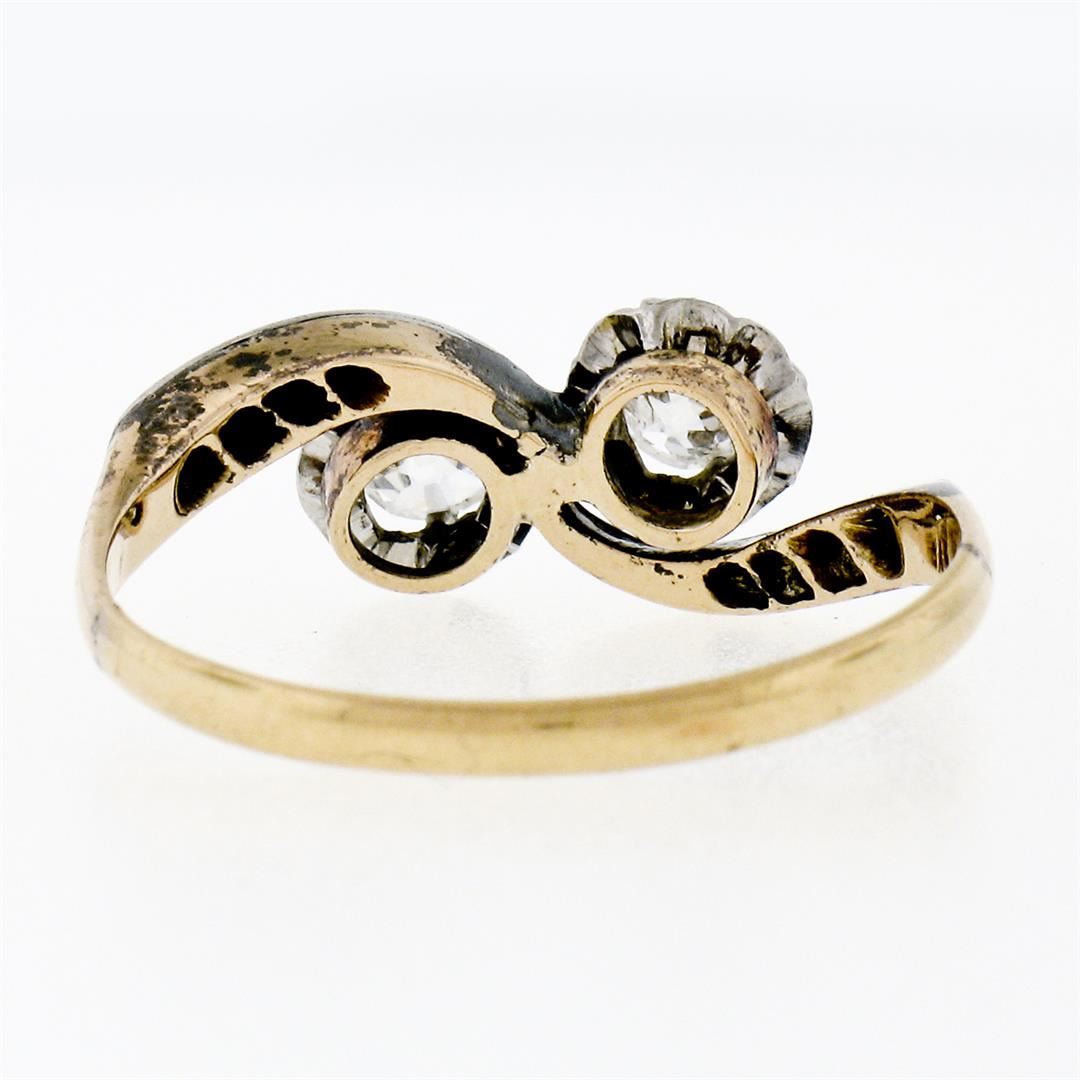 An antique solid 14k yellow gold and platinum top bypass ring, featuring 2 old european cut natural diamonds (G/H - SI1/SI2; 0.42ctw). and 8 rose cut natural diamonds (G/H - SI1/SI2; 0.12ctw). The ring is size 7,0, weighs a total of 2.49 grams, and measures 7.30mm wide.