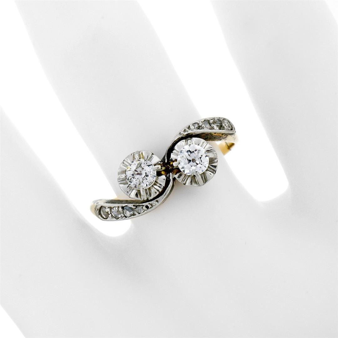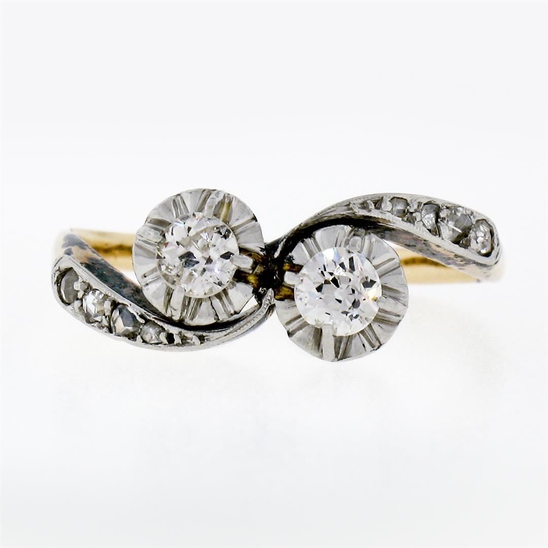 An antique solid 14k yellow gold and platinum top bypass ring, featuring 2 old european cut natural diamonds (G/H - SI1/SI2; 0.42ctw). and 8 rose cut natural diamonds (G/H - SI1/SI2; 0.12ctw). The ring is size 7,0, weighs a total of 2.49 grams, and measures 7.30mm wide.
