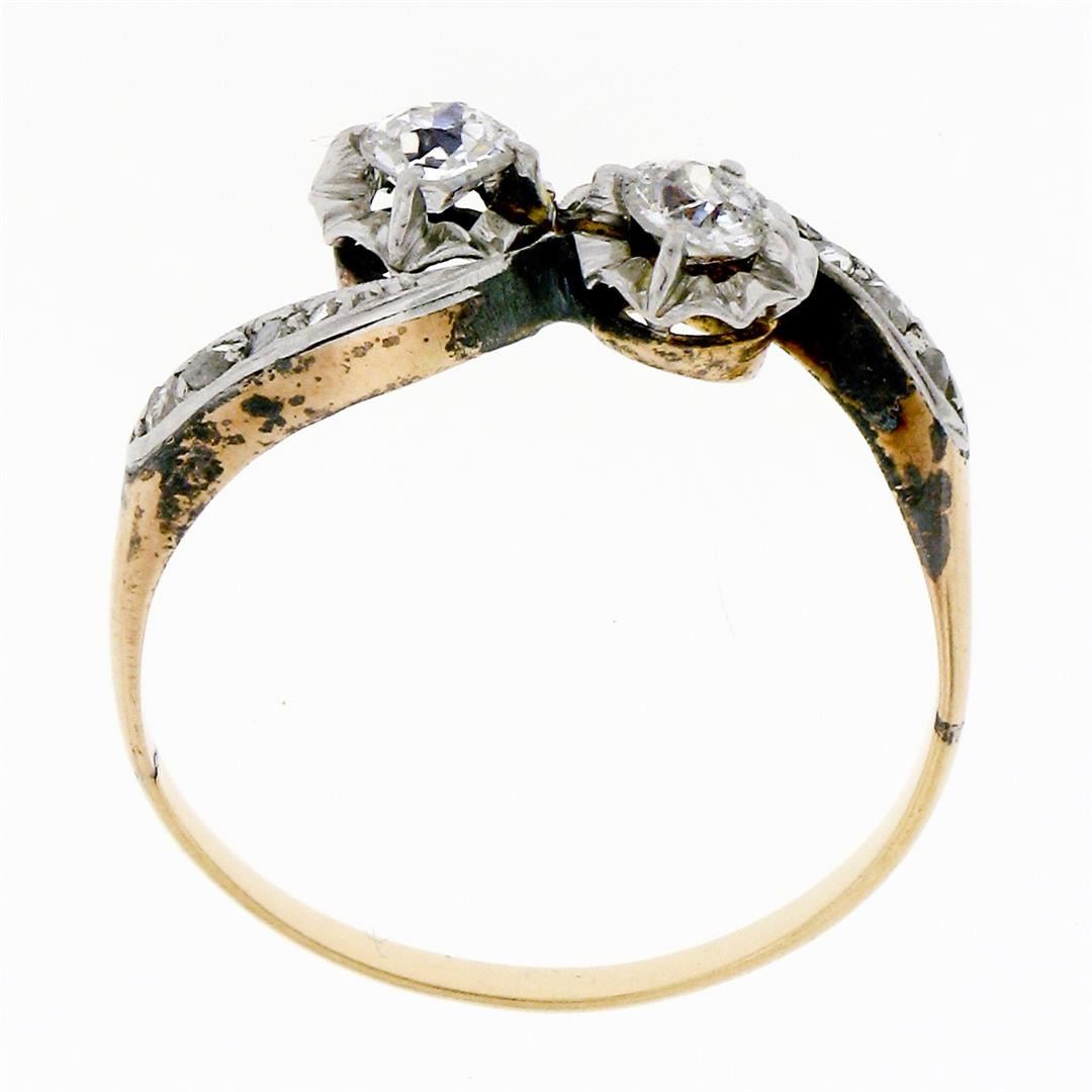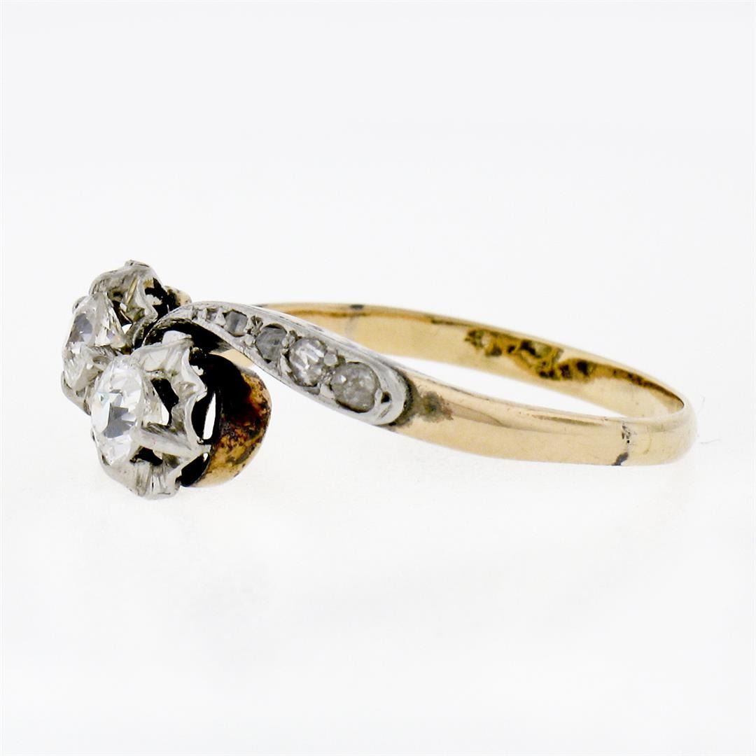 An antique solid 14k yellow gold and platinum top bypass ring, featuring 2 old european cut natural diamonds (G/H - SI1/SI2; 0.42ctw). and 8 rose cut natural diamonds (G/H - SI1/SI2; 0.12ctw). The ring is size 7,0, weighs a total of 2.49 grams, and measures 7.30mm wide.