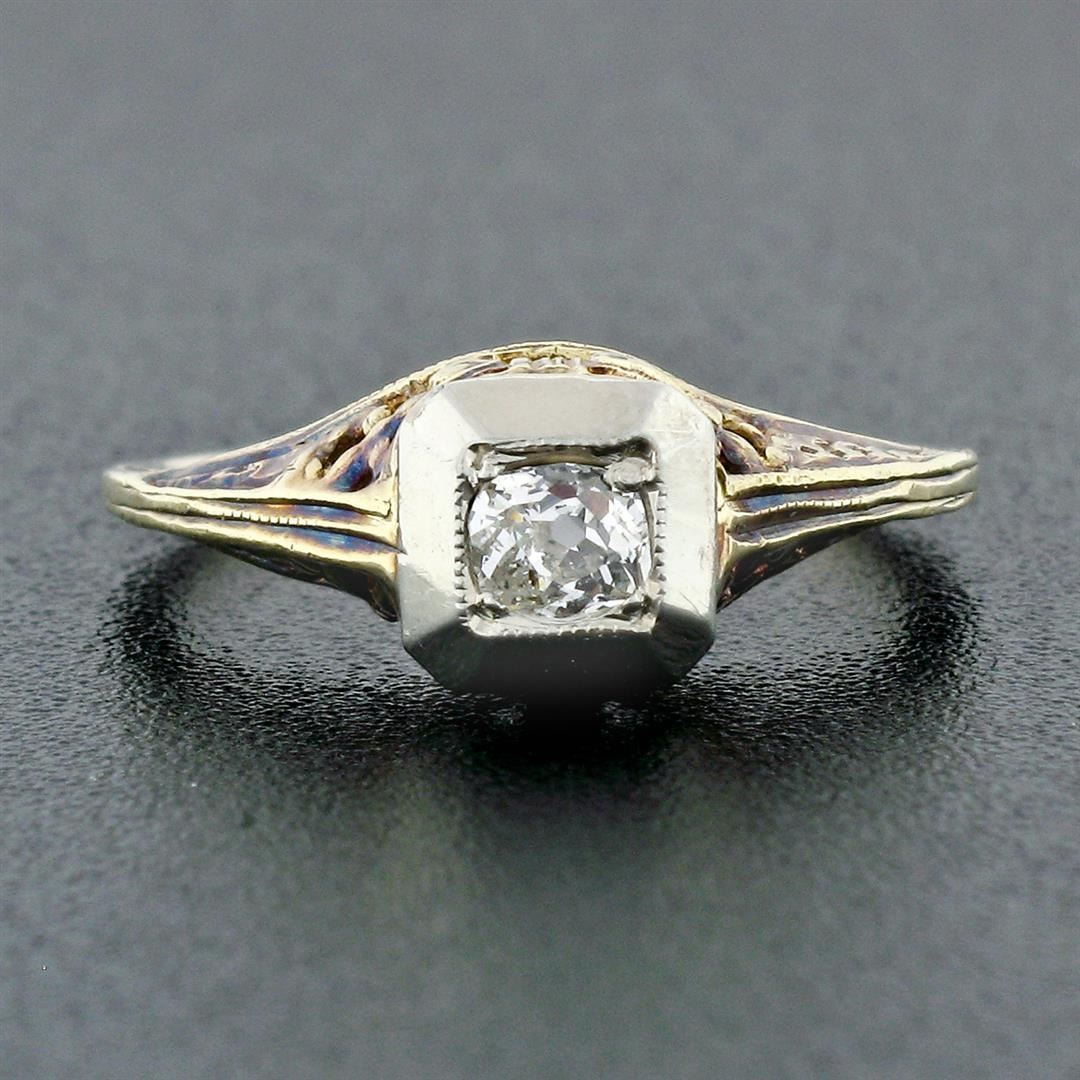 Antique Edwardian 14K TT Gold 0.15 ctw Old Mine Diamond Filigree Engagement Ring