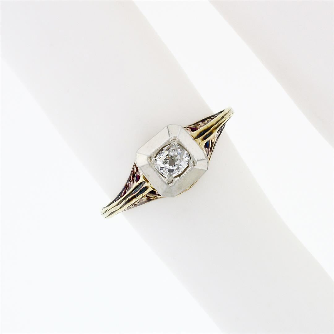 An antique edwardian solid 14k yellow & white gold engagement ring, with 1 old mine cut natural diamond (G - VS2 ; 0.15ct). The ring is size 3.5, weighs a total of 1.26 grams, and measures 6.0mm wide.