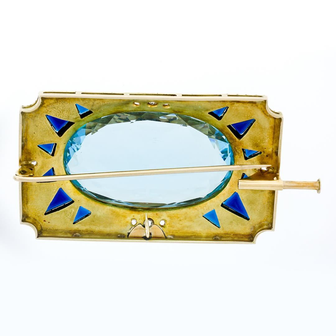 An antique solid 18k yellow gold & platinum brooch, featuring 1 oval cut blue stone (36.0x23.5mm ), 12 triangular cut blue stones (5.10x3.35mm and 7.0x5.5mm), and 18 round rose cut natural diamonds (H/I - VS2 to SI2 ; 0.28ctw). Measures 33.40x53.50mm and weighs a total of 27.55 grams.