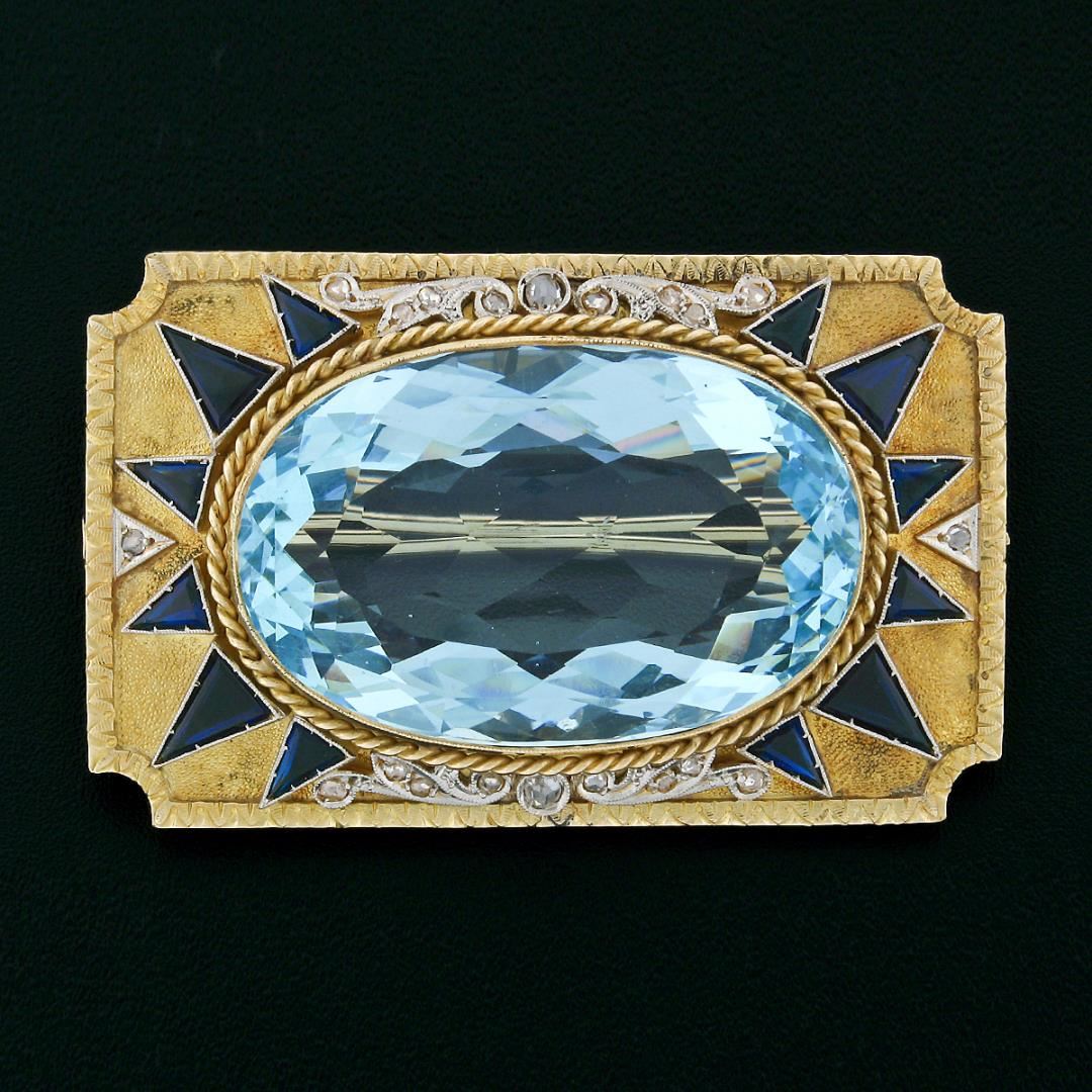 An antique solid 18k yellow gold & platinum brooch, featuring 1 oval cut blue stone (36.0x23.5mm ), 12 triangular cut blue stones (5.10x3.35mm and 7.0x5.5mm), and 18 round rose cut natural diamonds (H/I - VS2 to SI2 ; 0.28ctw). Measures 33.40x53.50mm and weighs a total of 27.55 grams.