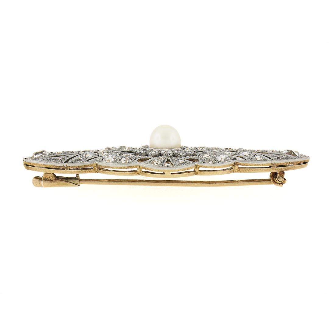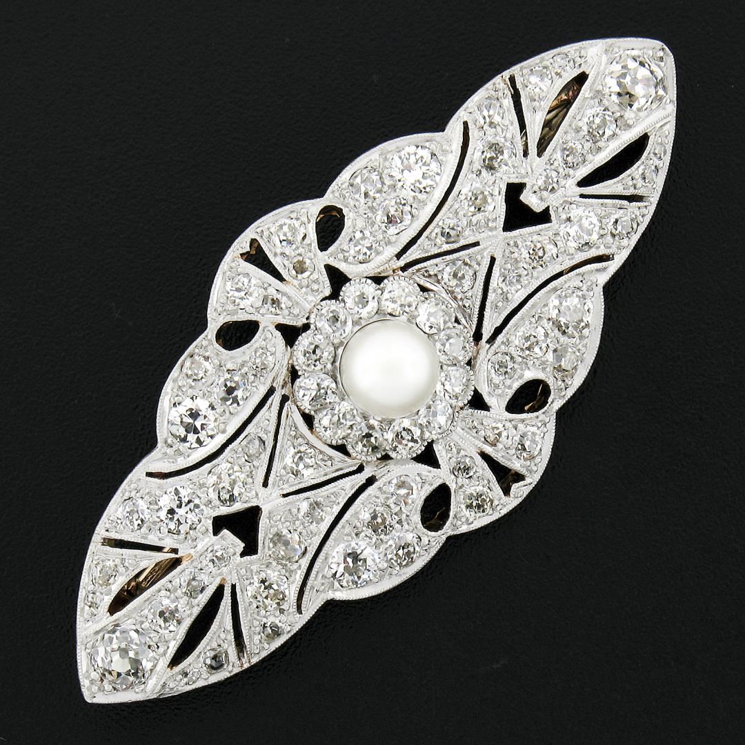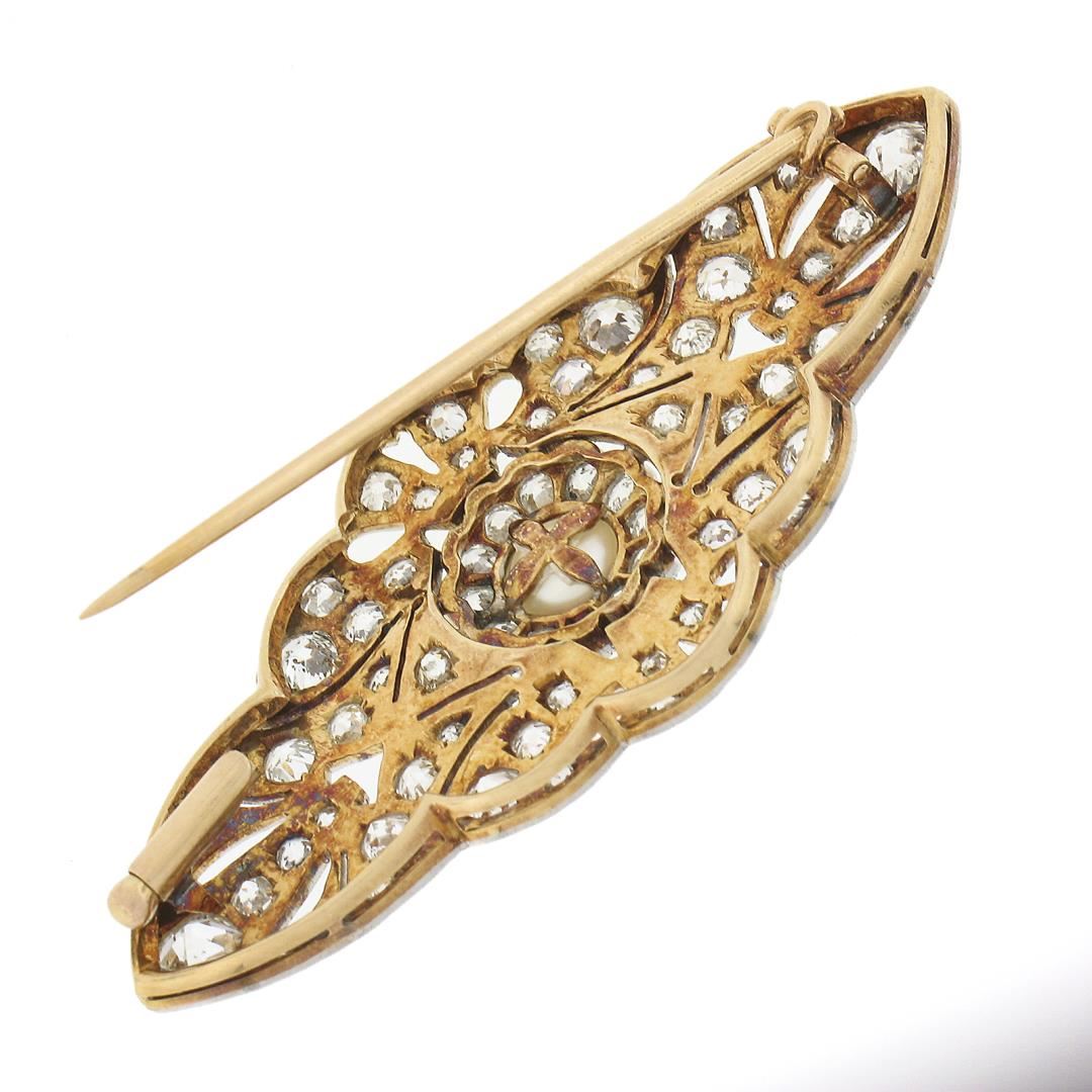 A solid 18k yellow gold & platinum brooch, featuring 1 round shape cultured pearl (6.35mm), and 72 old single, european & mine cut natural diamonds (G-L - VS2-I2 ; 3.60ctw). Measures 57x25.6mm and weighs a total of 13.47 grams.