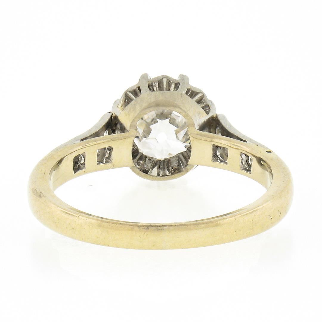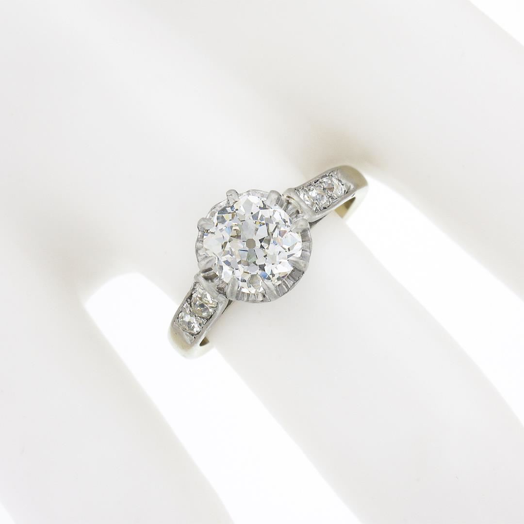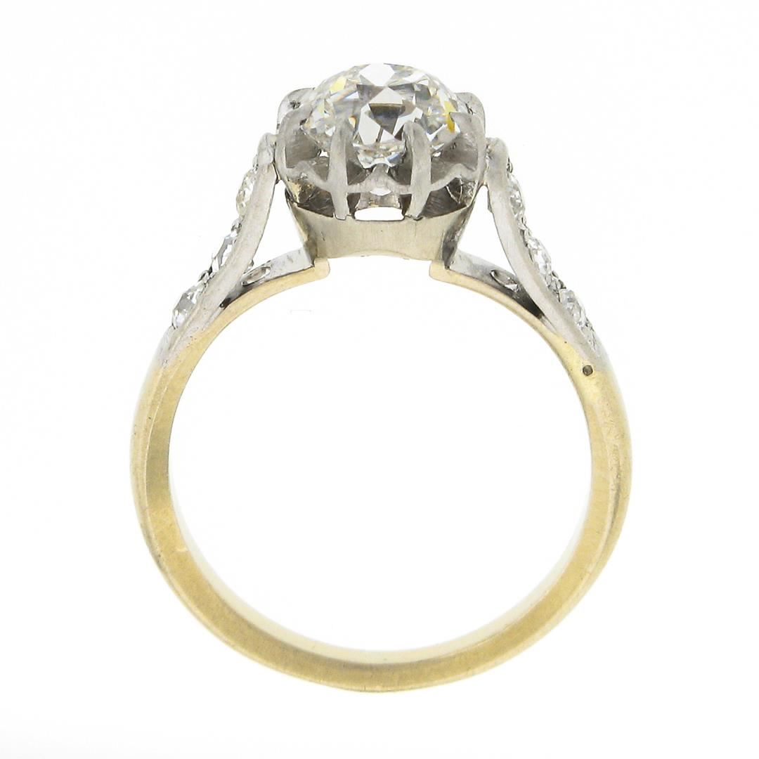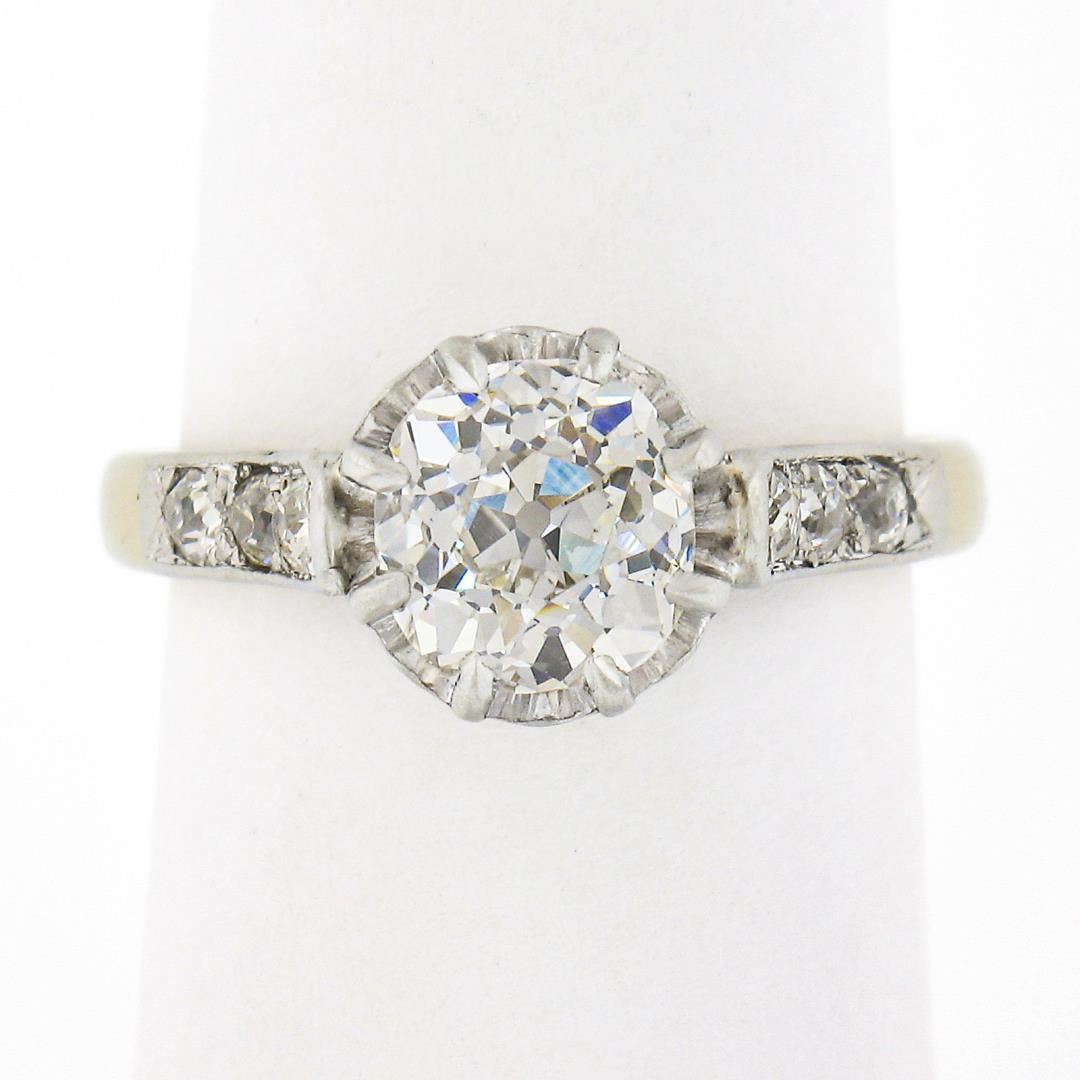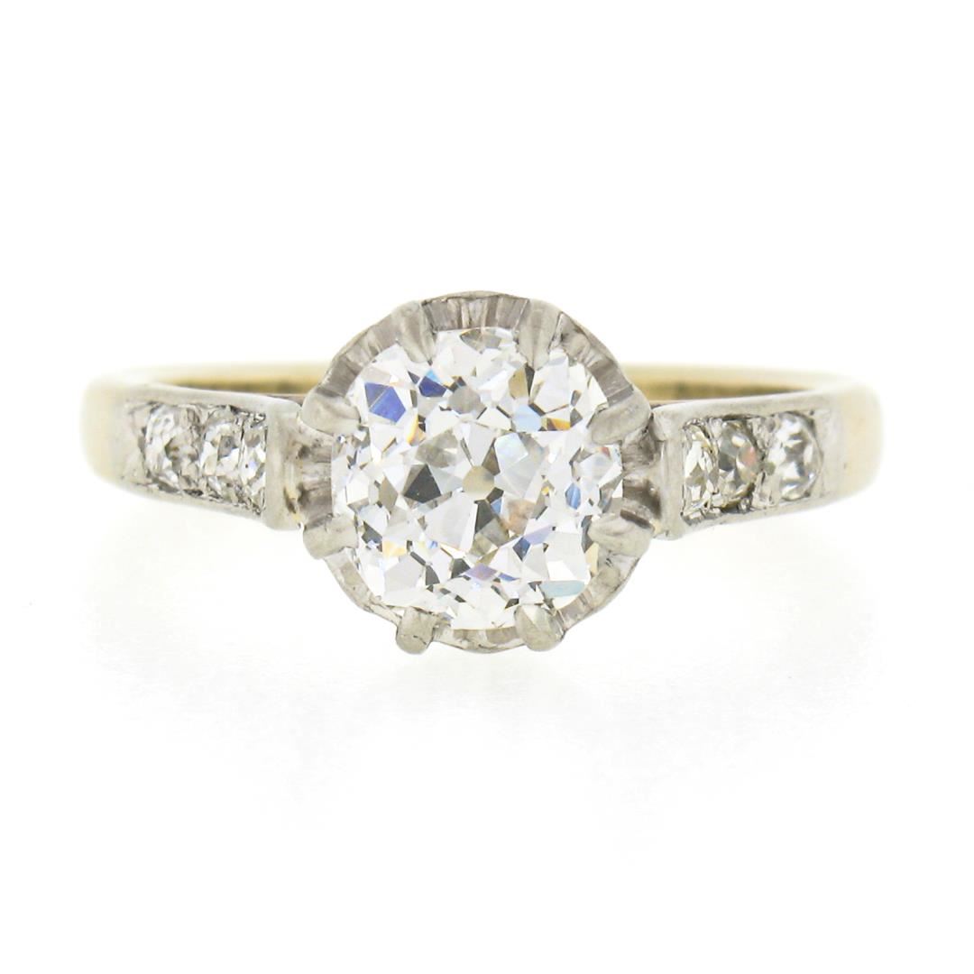 An antique solid 18k yellow gold & platinum ring, with 1 GIA graded old european cut natural diamond (H - VS2 ; 1.50ct), and 6 old mine cut natural diamonds (H/I - VS1/VS2 w/ a few SI ; 0.20ctw). . The ring is size 5.5, weighs a total of 3.81 grams, and measures 8.35mm wide.