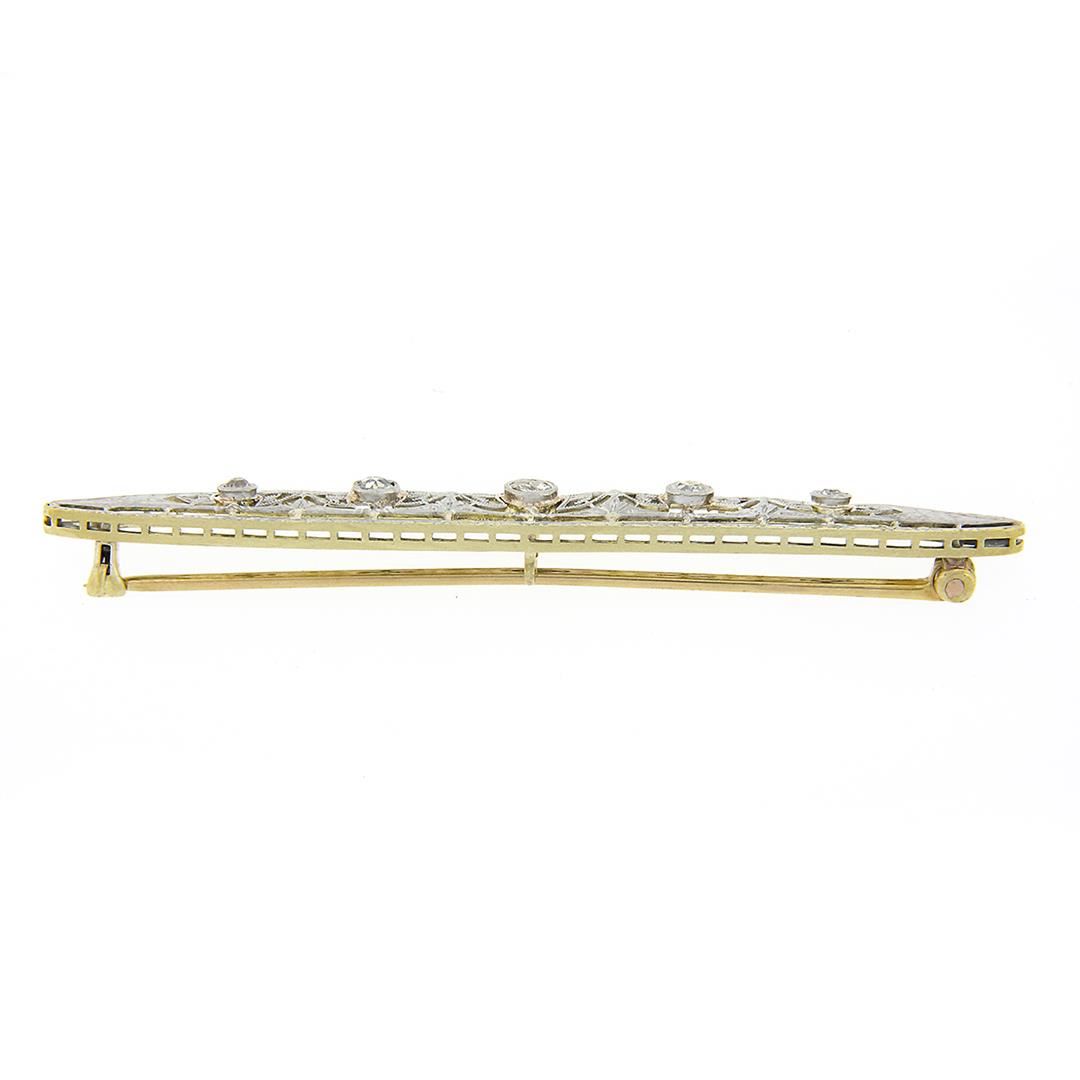 An antique solid 14k yellow and white gold bar pin brooch, with 5 old European cut natural diamonds (I/J - I1/I2 ; 0,30ctw). Measures 8.50x70.30mm and weighs a total of 5.87 grams.