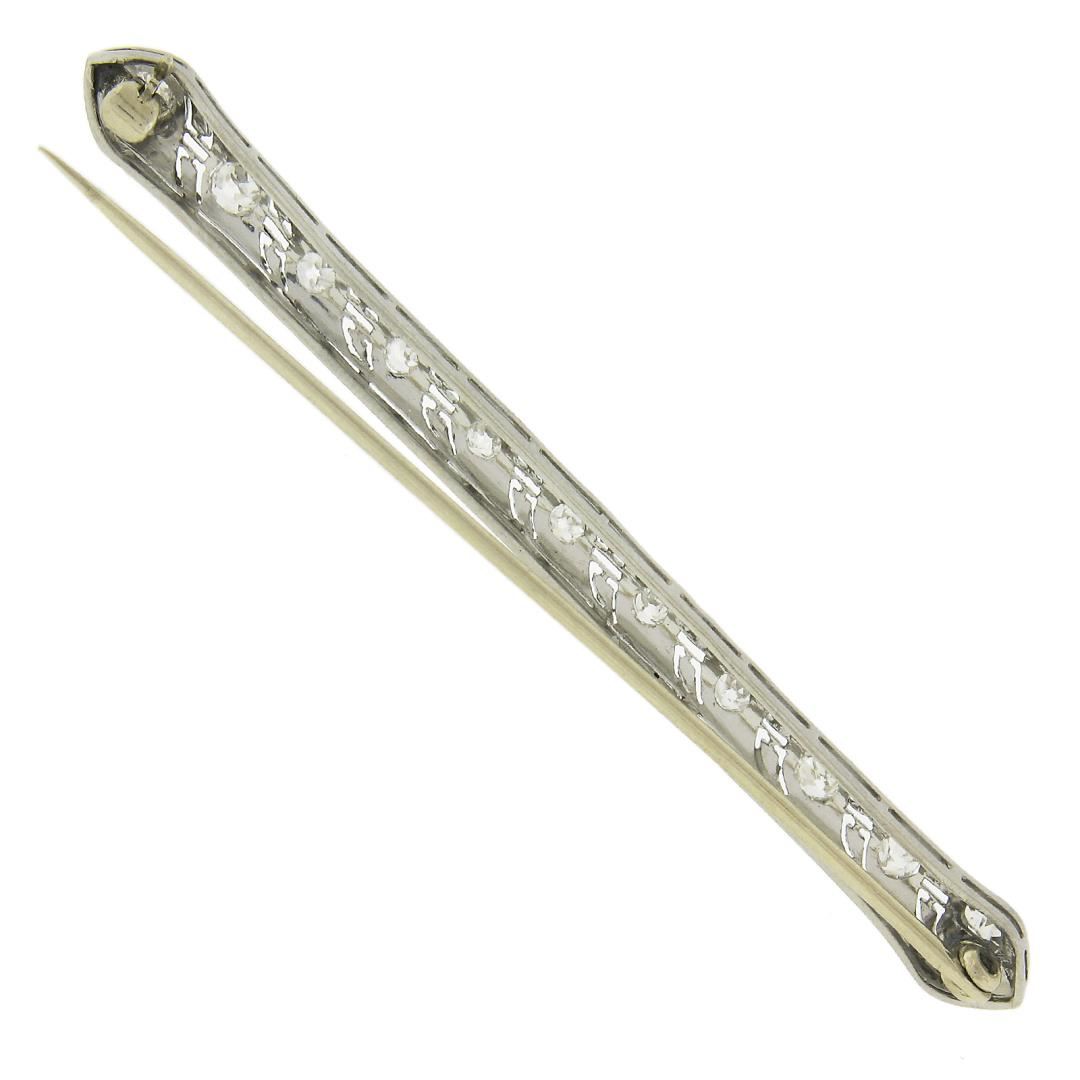 An antique solid paltinum & 14k white gold bar pin brooch, with 11 old european & old mine cut natural diamonds (F-H  - VS1-SI1 ; 1.0ctw (approx.) ). Measures 6.5x70.8mm and weighs a total of 7.11 grams.