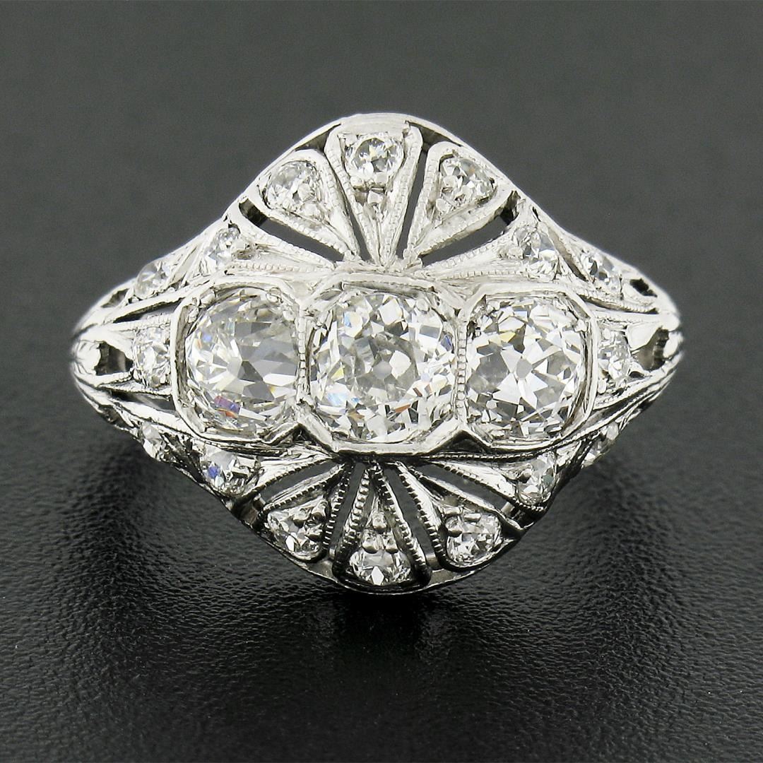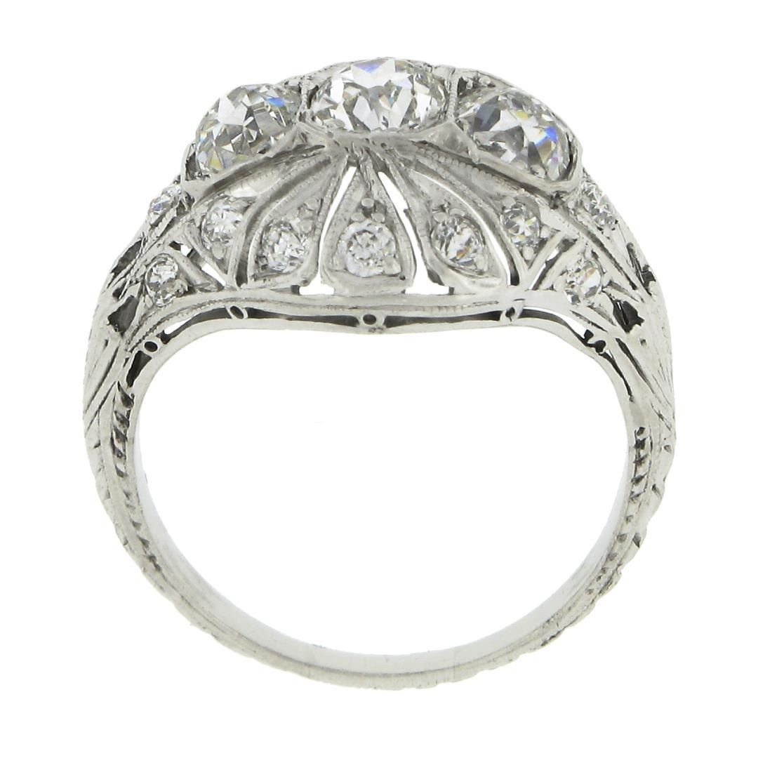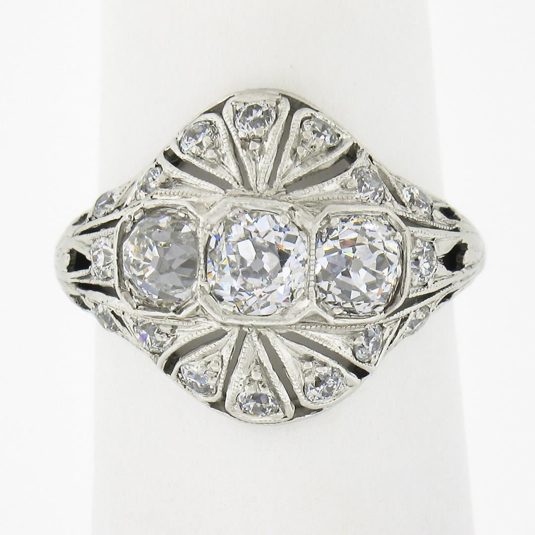 An antique solid platinum mosaic ring, with 3 early old european cut natural diamonds (H/I- VS2 ; 1.20ctw), and 16 old european cut natrual diamonds (H/I - VS2/SI1 ; 0.30ctw ). The ring is size 5.0, weighs a total of 3.80 grams, and measures 14.7mm wide.