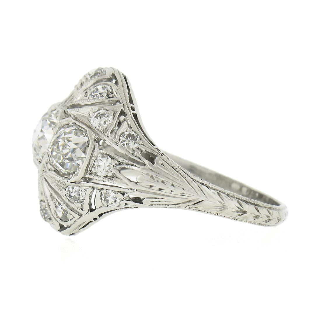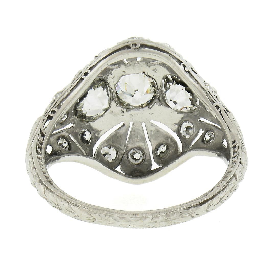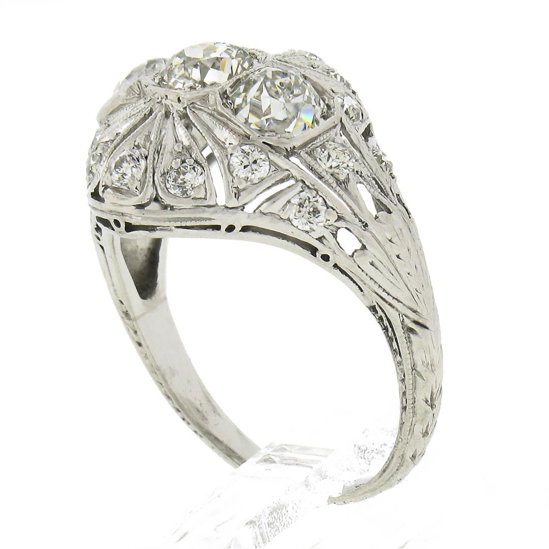 An antique solid platinum mosaic ring, with 3 early old european cut natural diamonds (H/I- VS2 ; 1.20ctw), and 16 old european cut natrual diamonds (H/I - VS2/SI1 ; 0.30ctw ). The ring is size 5.0, weighs a total of 3.80 grams, and measures 14.7mm wide.