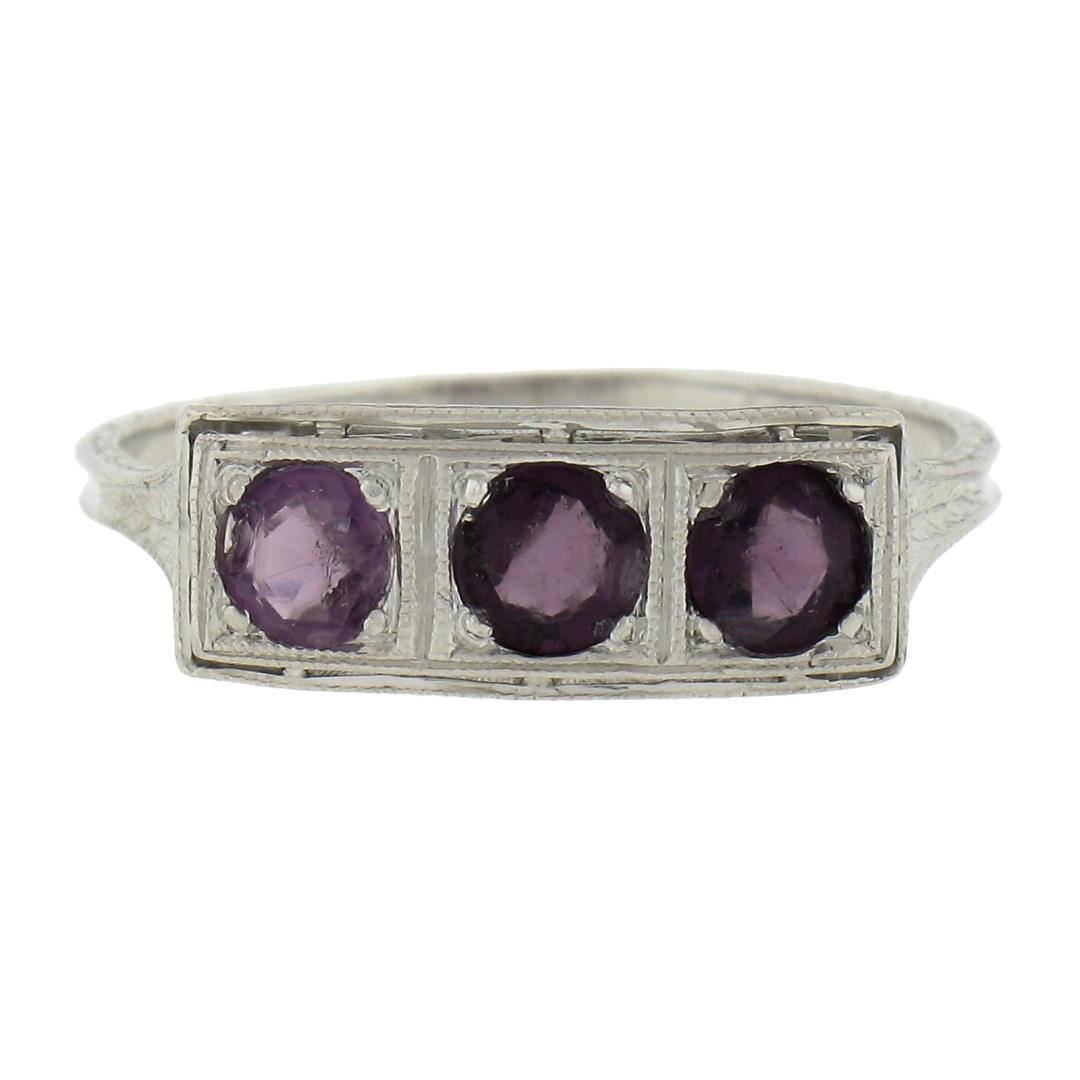 An antique solid platinum 3 stones ring, with 3 old cut natural rhodolite garnets. The ring is size 8.0, weighs a total of 3.03 grams, and measures 6.3mm wide.